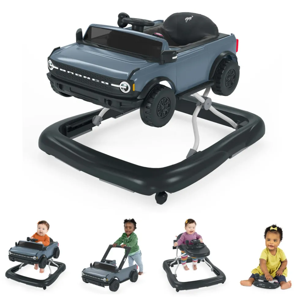 Gør dig klar til at udforske fantasidestinationer, du aldrig har været på før, med Bright Starts Ford Bronco gåvogn! Når du har brug for sjov i et højt gear, er denne Bronco gåvogn den perfekte off-roader til opgaven. Den klassiske 4-i-1 blå/grå gåvogn er bygget til eventyr og er designet til at understøtte flere legestadier, og to babyer kan lege på samme tid! I babywalker-tilstand kan de små børn, der er på vej til at gå, styre rundt i huset med ekstra stabilitet og støtte. Lidt større børn kan bruge den som en skubbevogn. De autentiske Bronco-lyde, lys, gearskifte, rat og udseendet på denne robuste gåbil vil sætte gang i fantasien hos dit barn. Du kan også løfte Bronco-rammen af for at få en lettere, mere bærbar gåvogn til rejser. Det aftagelige aktivitetscenter med rat kan bruges til leg på gulvet eller på farten. Vokser med barnet fra 6 måneder til 2 år. Gåvognen kan bruges af børn på op til 11 kg.