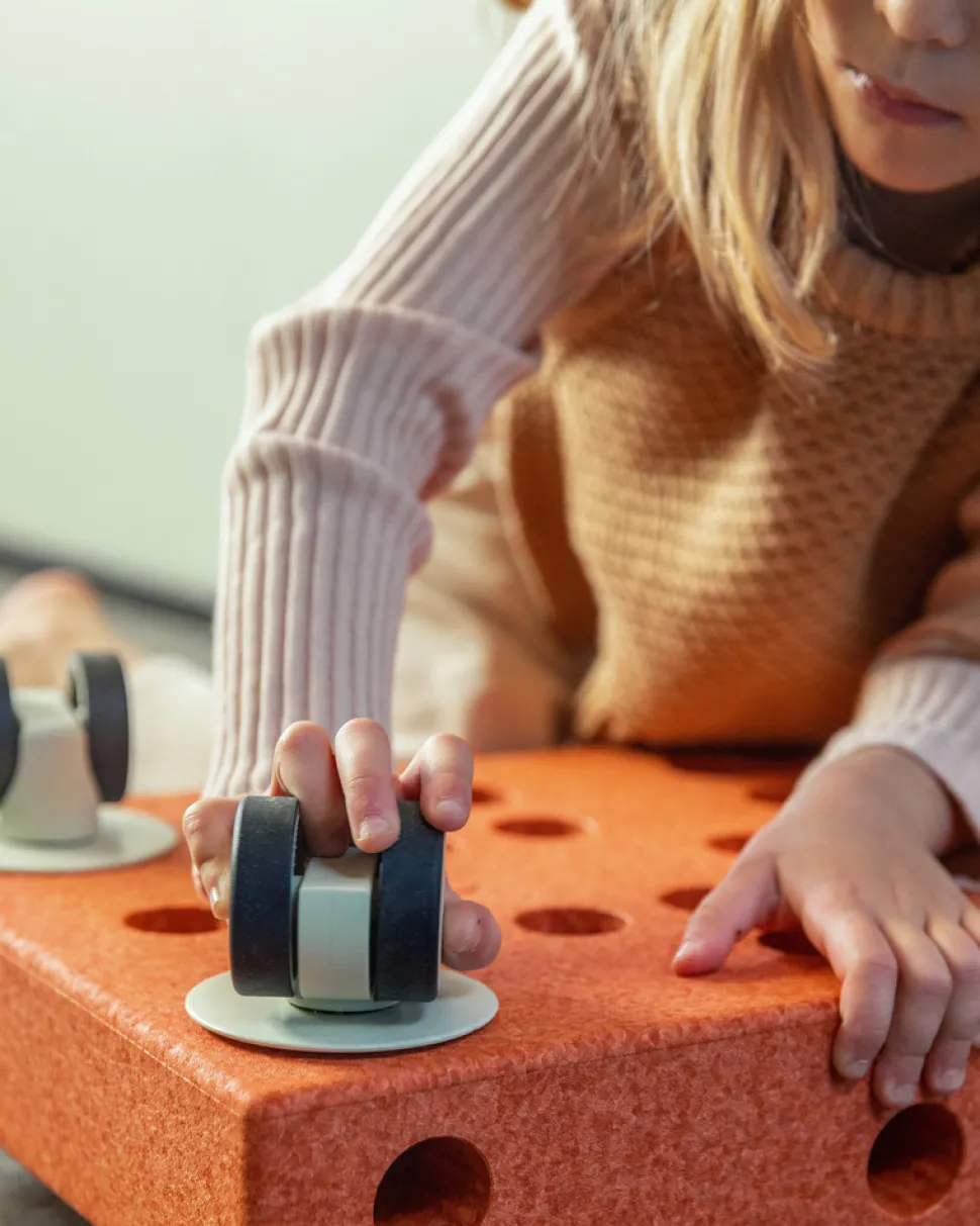 Drejehjulene er en del af byggesystemet fra MODU — et innovativt og unikt byggelegetøj med skarpt fokus på design og funktionalitet.