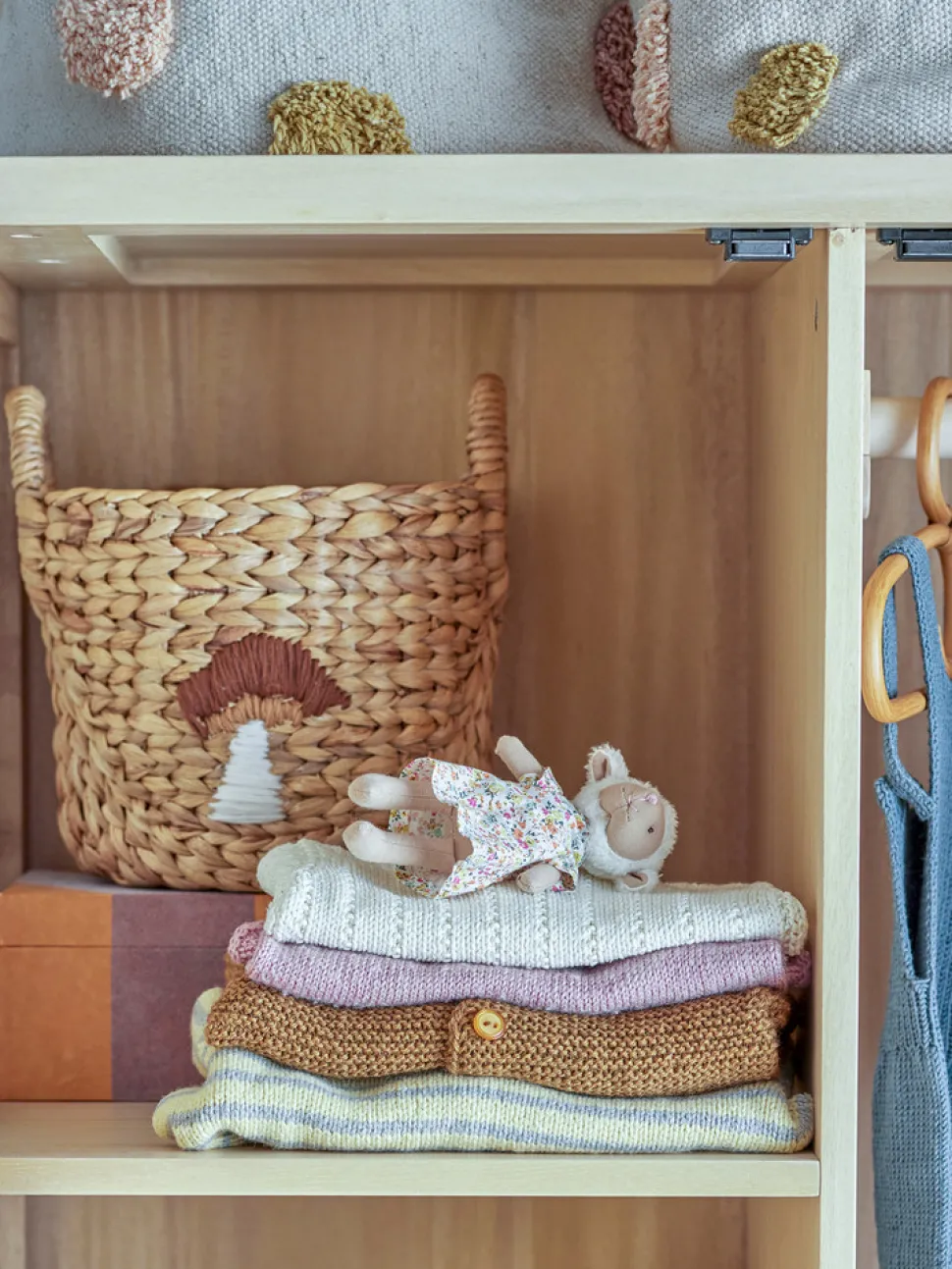 Agnes kurven fra Bloomingville MINI er et sæt af to smukke kurve, som er praktiske og dekorative på samme tid. Kurvene har håndtag og kommer i to forskellige størrelser, hvilket gør dem perfekte til opbevaring af legetøj og bamser. Den ene kurv er broderet med en fin regnbue, mens den anden har en sød svamp broderet på. Begge kurve er flettet i vandhyacint, hvilket giver dem et naturligt og organisk look. Med Agnes Kurvene kan du skabe orden på en smuk og hyggelig måde.