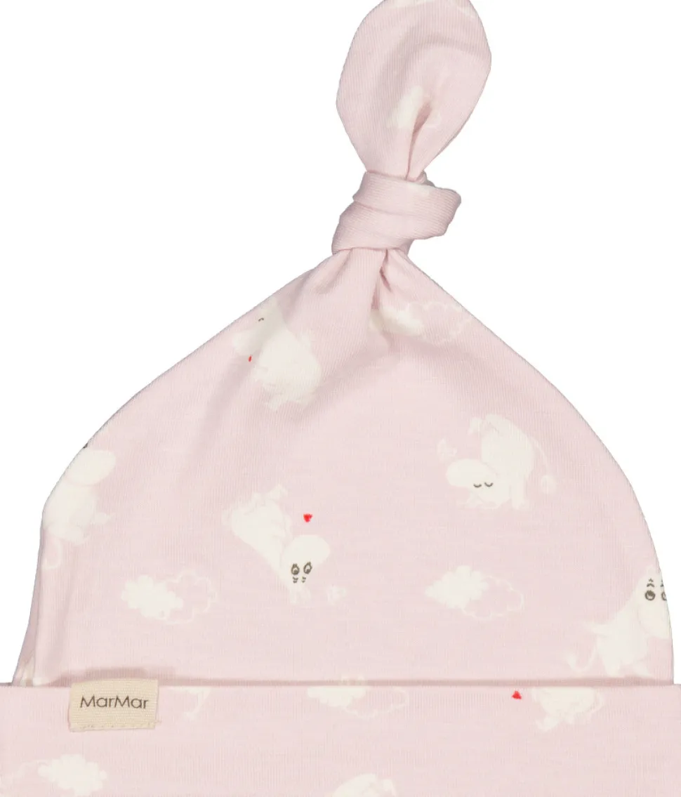 Lille hue med Moomin print til nyfødt med kant der kan foldes ned og med en sød knude på toppen. Huen er både blød, strækbar og behagelig at have på.