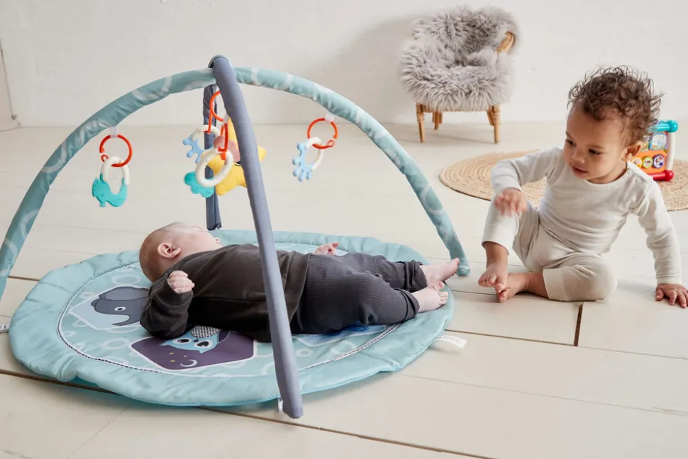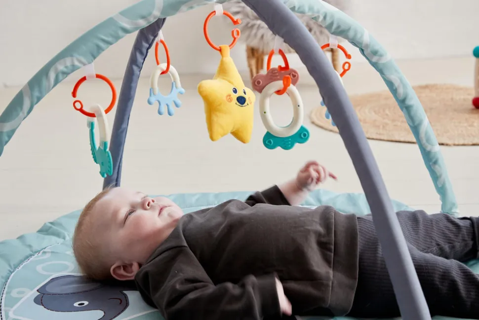 Aktivitetsstativ med legemåtte fra Scandinavian Baby Products. Aktivitetsstativet er i ZOO-tema. Der medfølger 5 stykker aktivitetslegetøj.