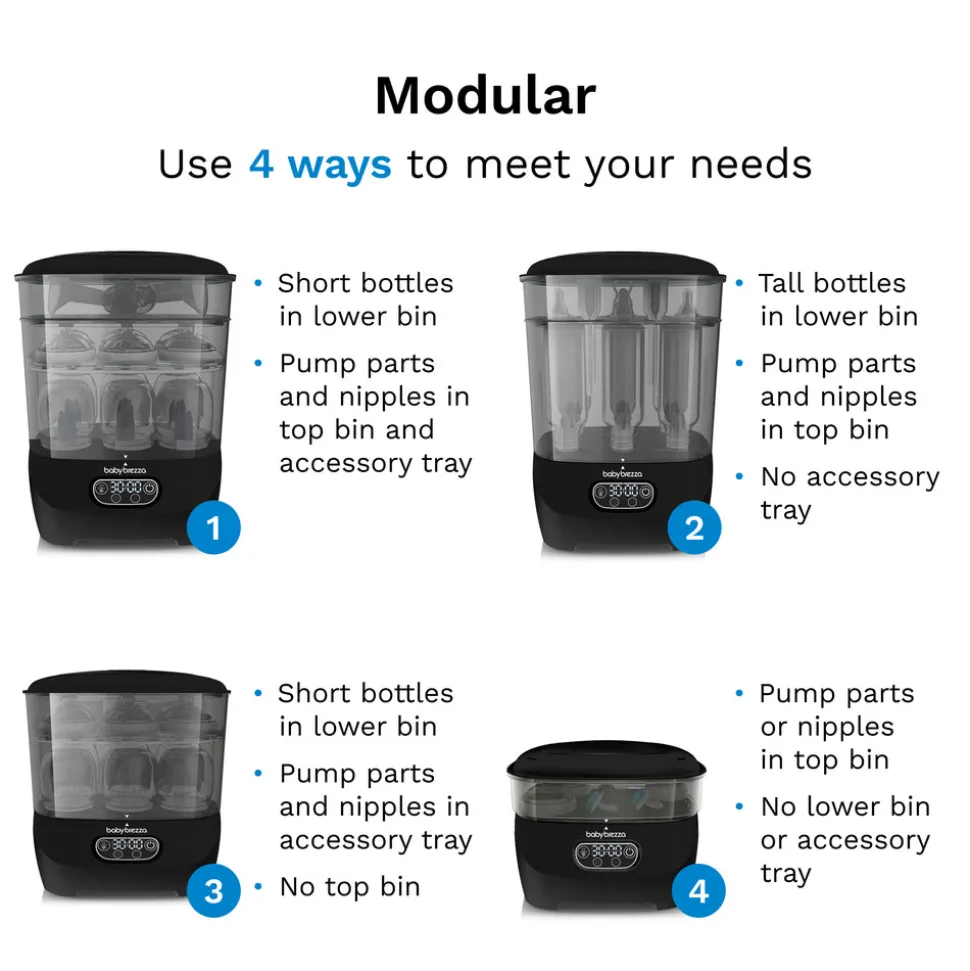 - Brugervenlig: 4-i-1-funktionalitet med LCD-kontrolpanel, der giver dig mulighed for at vælge mellem sterilisator og tørretumbler, kun sterilisator, kun tørretumbler eller opbevaringssystem.