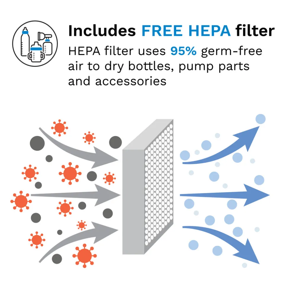 - Dræber bakterier: Naturlig damp dræber 99,9% af bakterierne, og tørringen sker automatisk 33% hurtigere med varm luft, der er 95% bakteriefri takket være det udskiftelige HEPA-filter. Produkter forbliver steriliseret indeni i op til 24 timer.