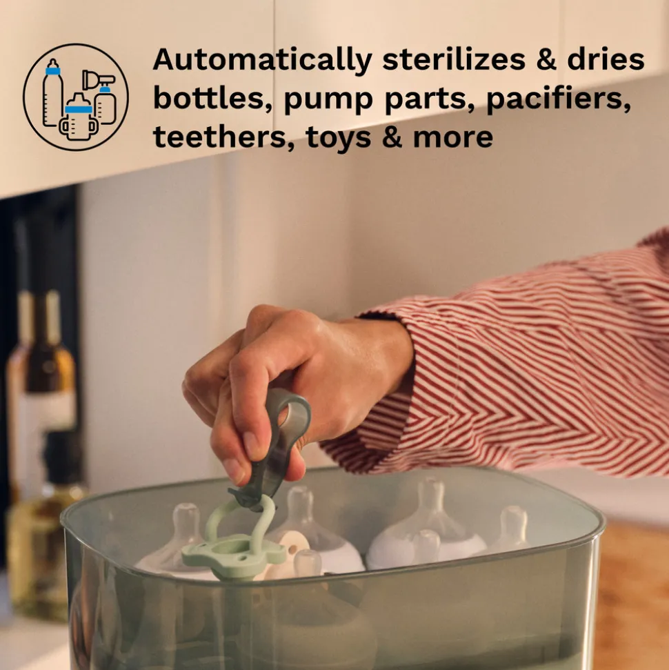 - Automatisk sterilisering og tørring: Spar tid ved at sterilisere og tørre alle mærker af flasker, pumpedele, sutter, bideringe, sippy-kopper, legetøj og andet tilbehør i ét enkelt trin.