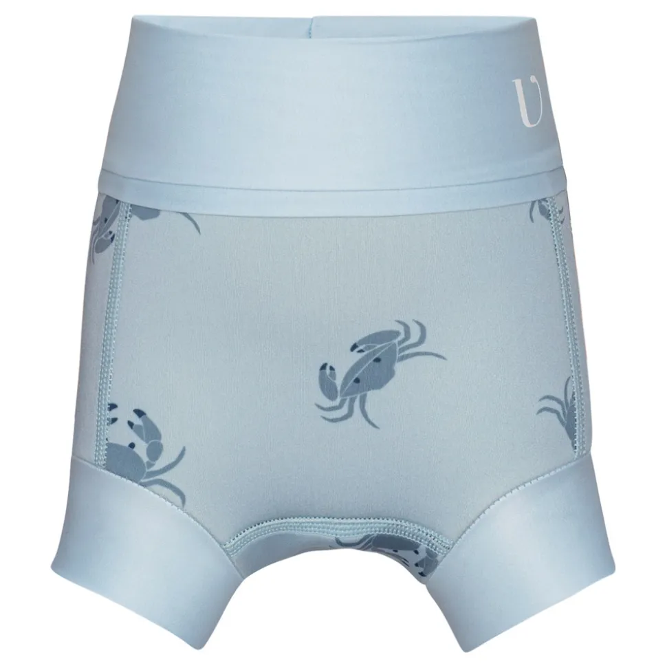 Ble- badebukserne er lavet i smidigt neopren og skal sidde til, for at være tætte nok og vil derfor synes lidt strammere end andre ble- badebukser. Rul linningen ned og før barnets ben igennem og rul derefter linningen op på plads. Med lidt øvelse er det super nemt.
