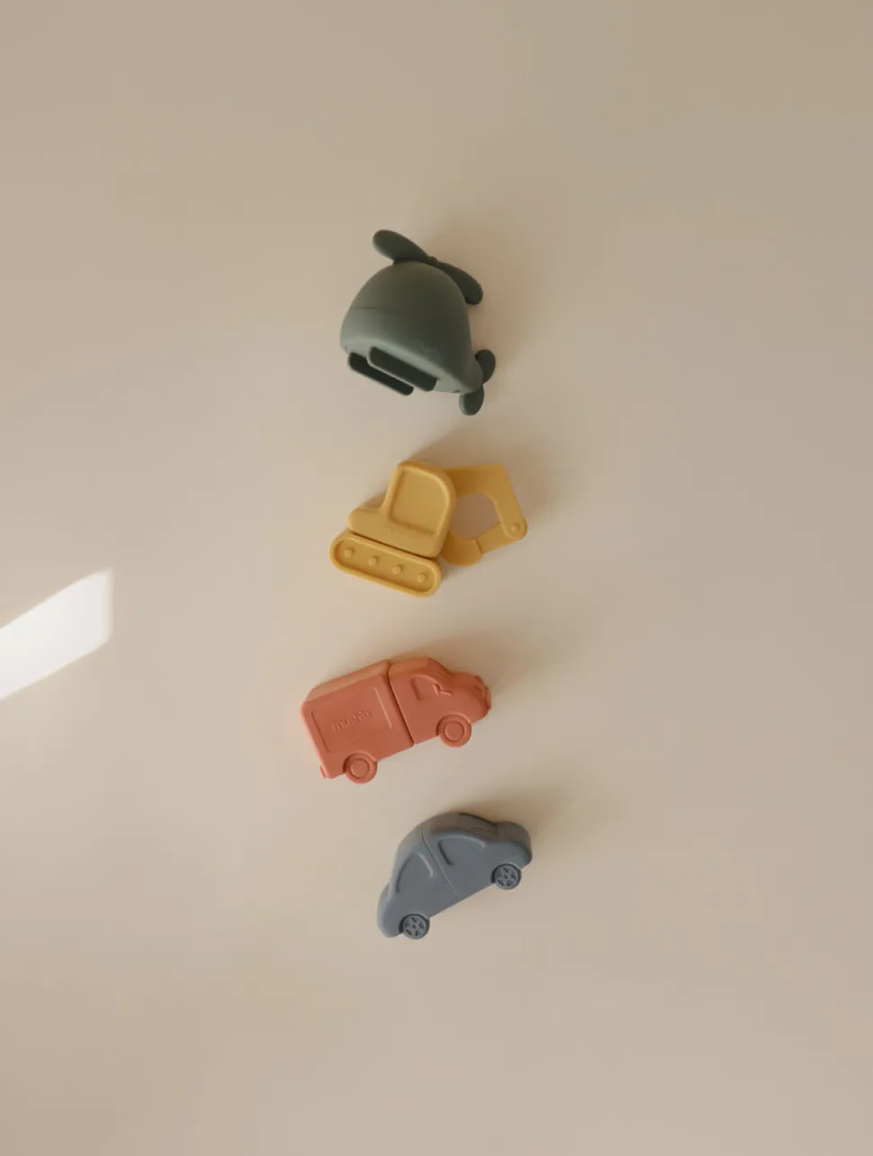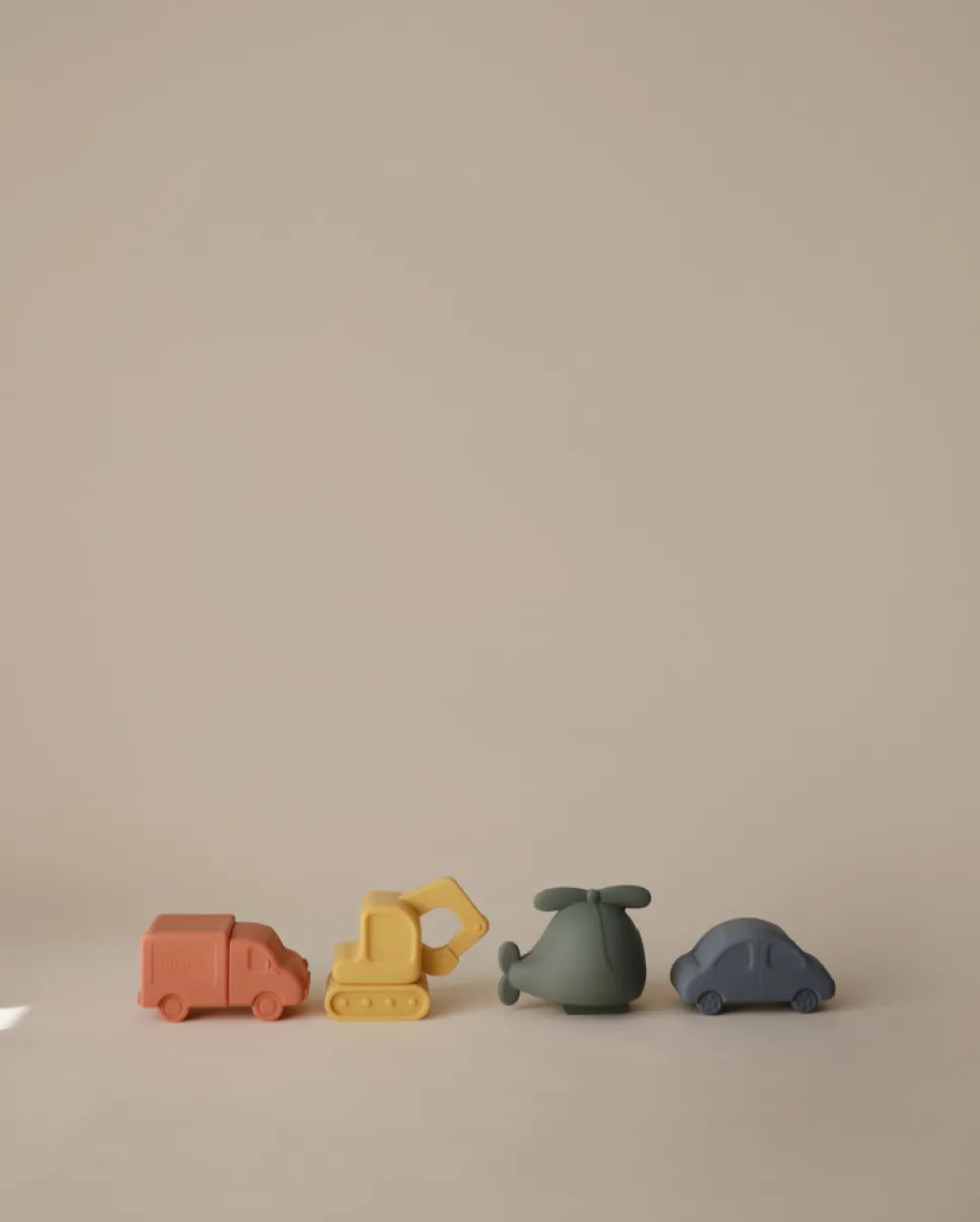 De små bliver ofte fascineret af køretøjer; nu kan de få fire af dem som søde små silikonefigurer, perfekte til badetid.