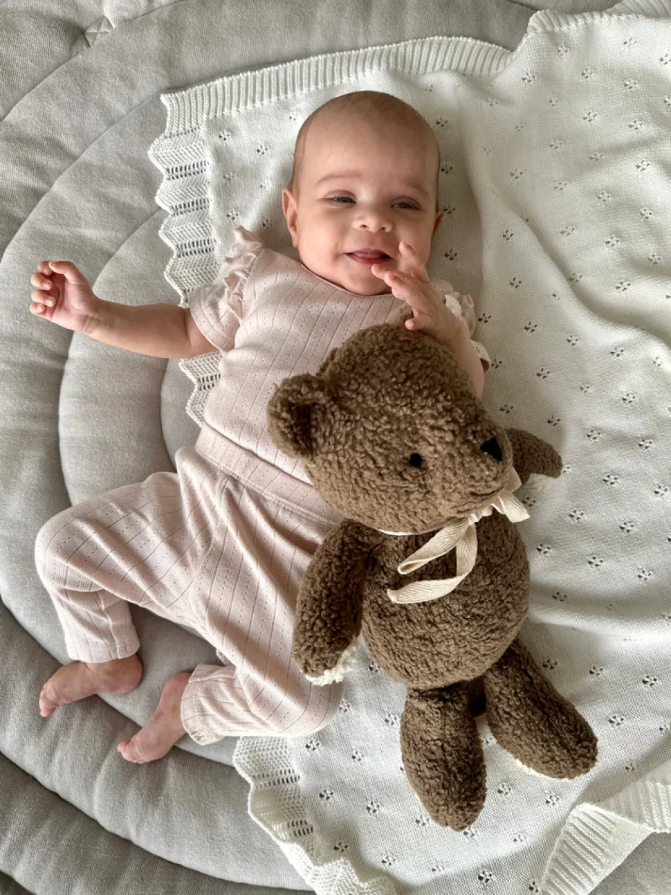 Blød strikket kanin med rolig musik. Bamsen er en kær og uimodståelig krammeven, og med sine dinglende lange øre, arme og ben samt søde smil, bliver den hurtigt en af barnets yndlings bamser. Træk i træringen og uroen vil spille den fineste, klare og rolige vuggevise “Sleep baby sleep”, som kan få enhver baby til at slappe af.