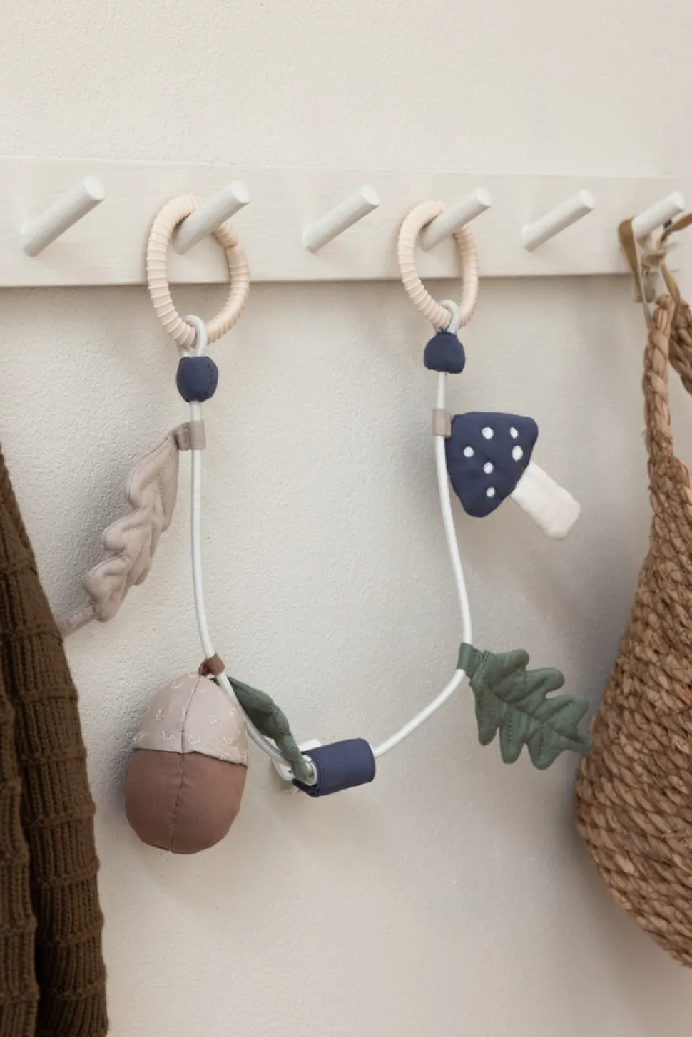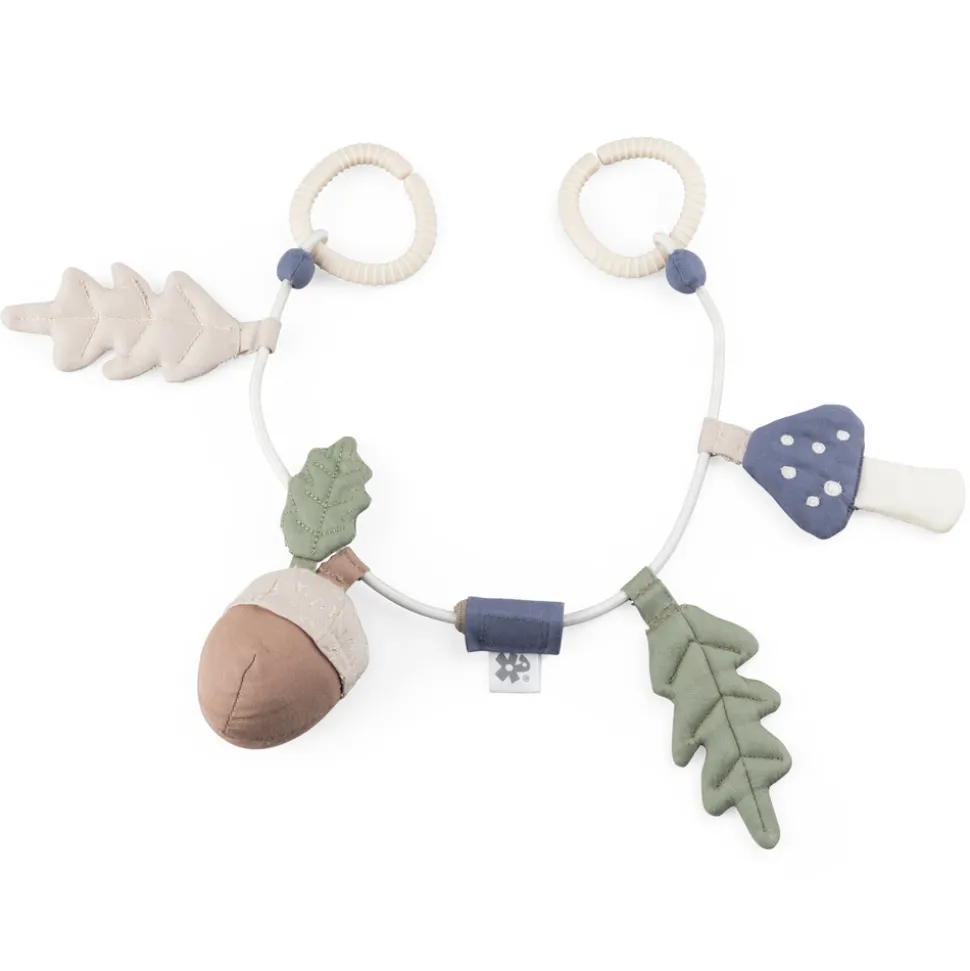 De fire bløde figure på barnevognskæden – et agern, en svamp og to blade – har fine detaljer og er fremstillet i certificeret økologisk bomuld. Barnevognskæde sættes nemt fast i hver side af barnevognen med praktiske C-ringe, og fungerer på samme måde som en uro, der fanger de mindstes interesse og virker beroligende. Kæden er 52 centimeter lang og elastisk, så den også kan passe til en lidt bredere barnevogn. Køb barnevognskæden til nybagte forældre, der gerne vil have dansk design og god kvalitet.