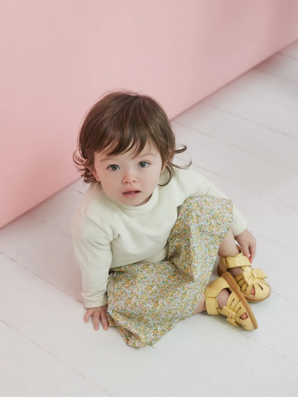 Begyndersandal med sløjfe og justerbar velcro. Lukket tå og fast hælkappe for maksimal støtte.