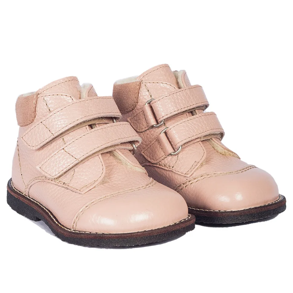 Begynder velcrosko med rummelig pasform, merino uldfoer og dekorative kontraststikninger.