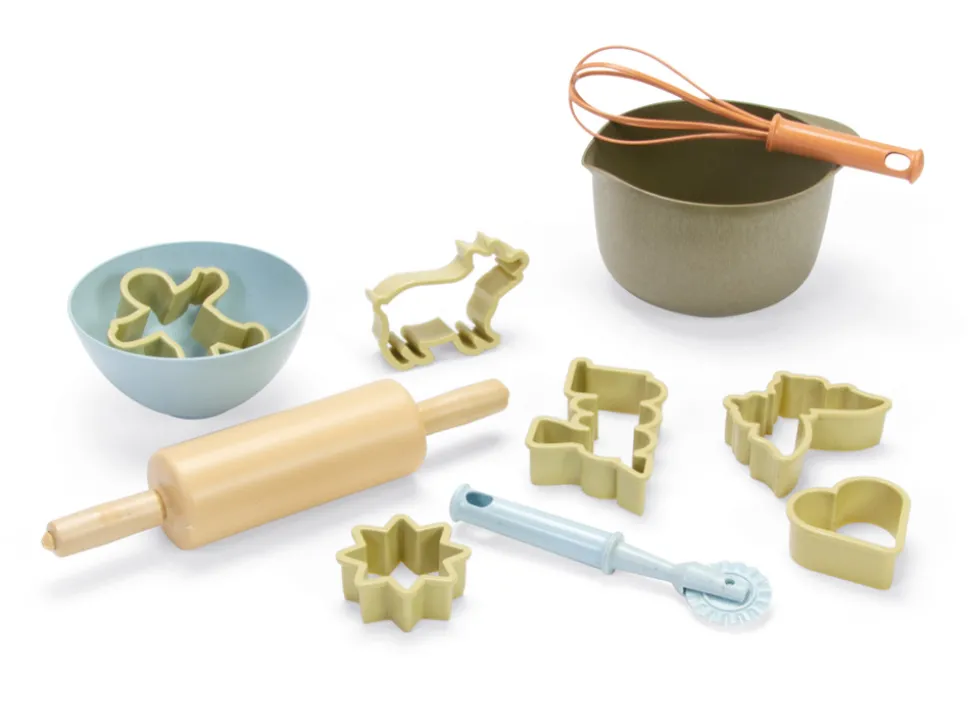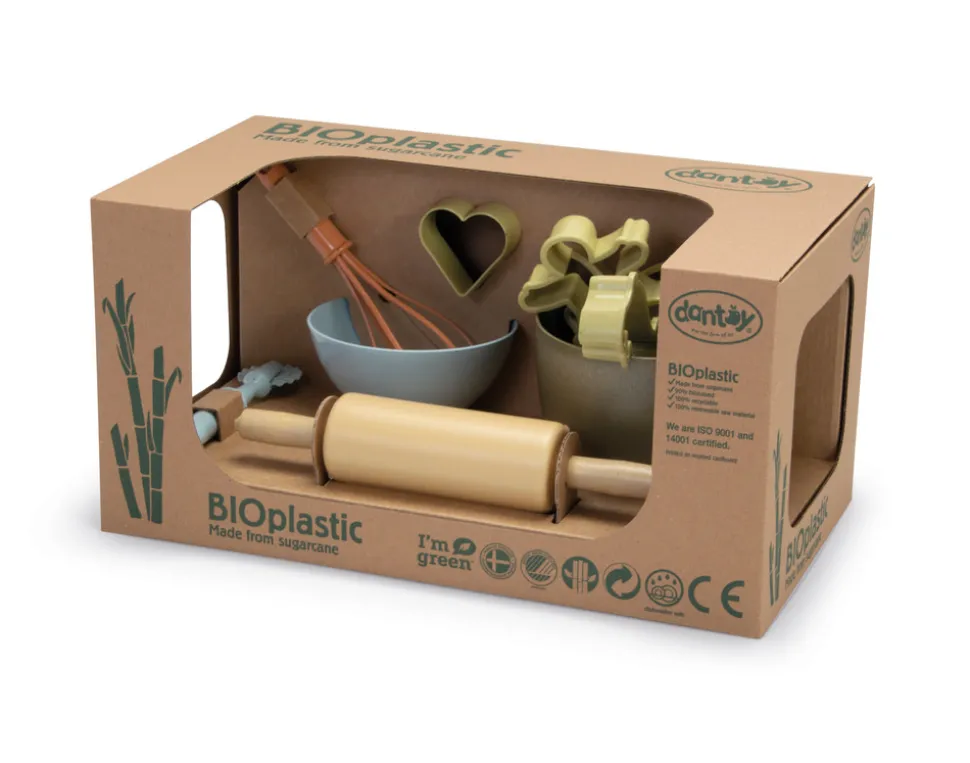 Bagesættet er danskproduceret bioplast legetøj fra dantoy der er fremstillet af sukkerrør, derved er produktet 100% genanvendeligt.