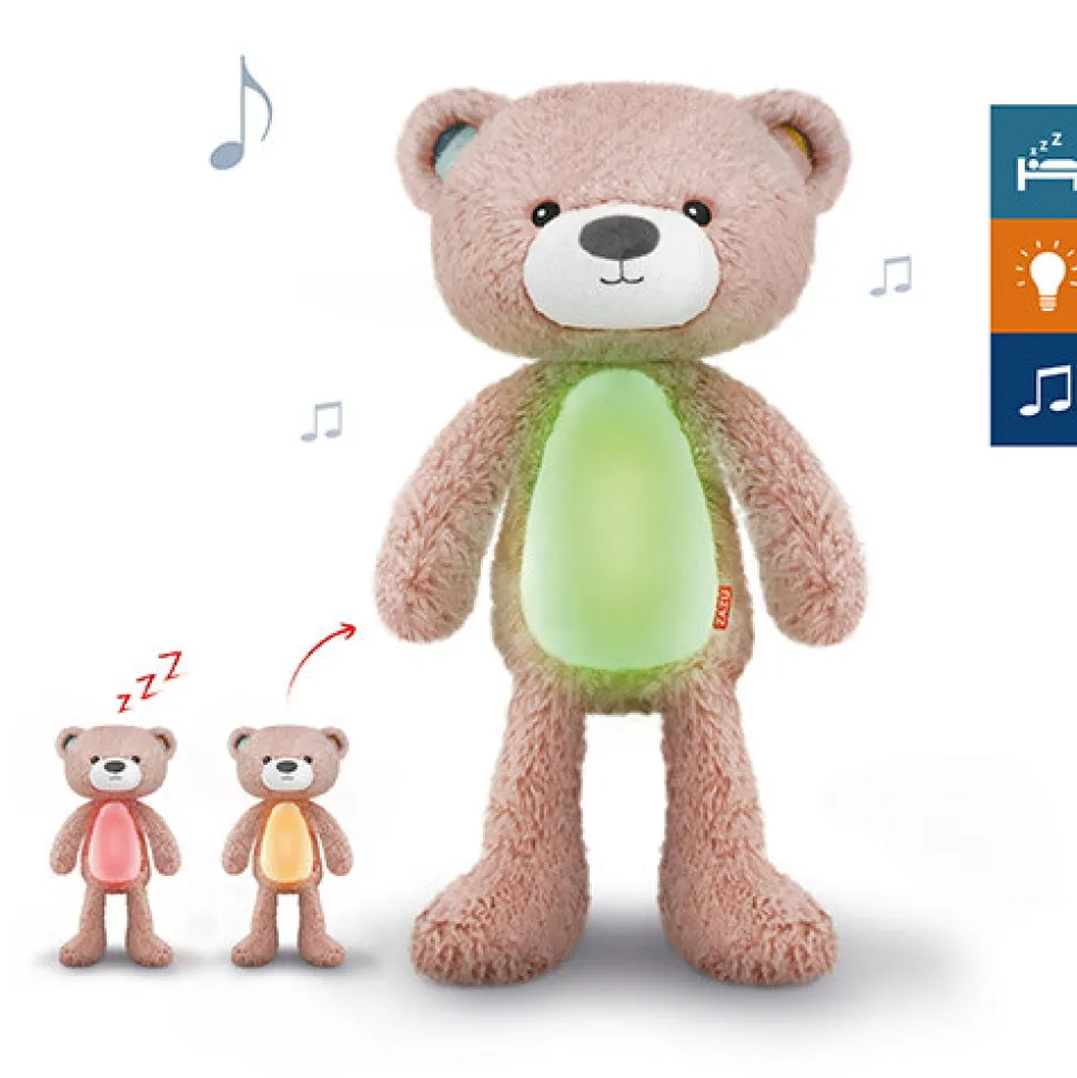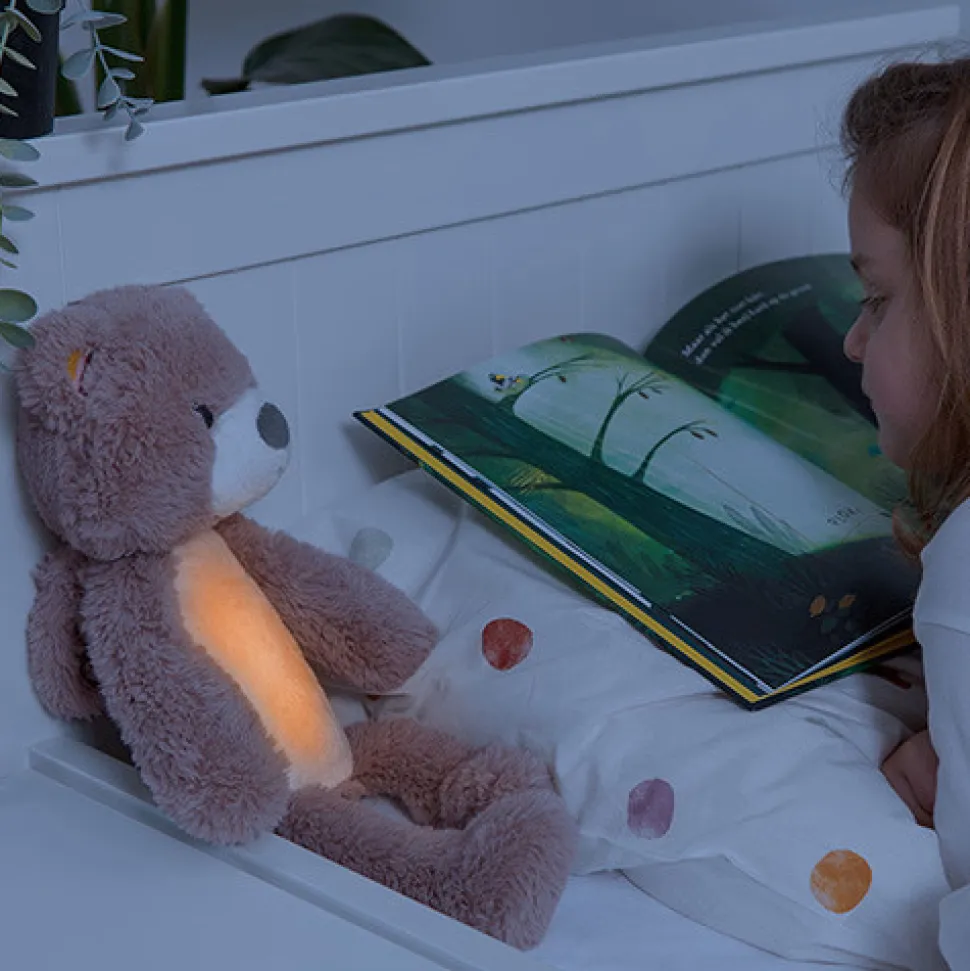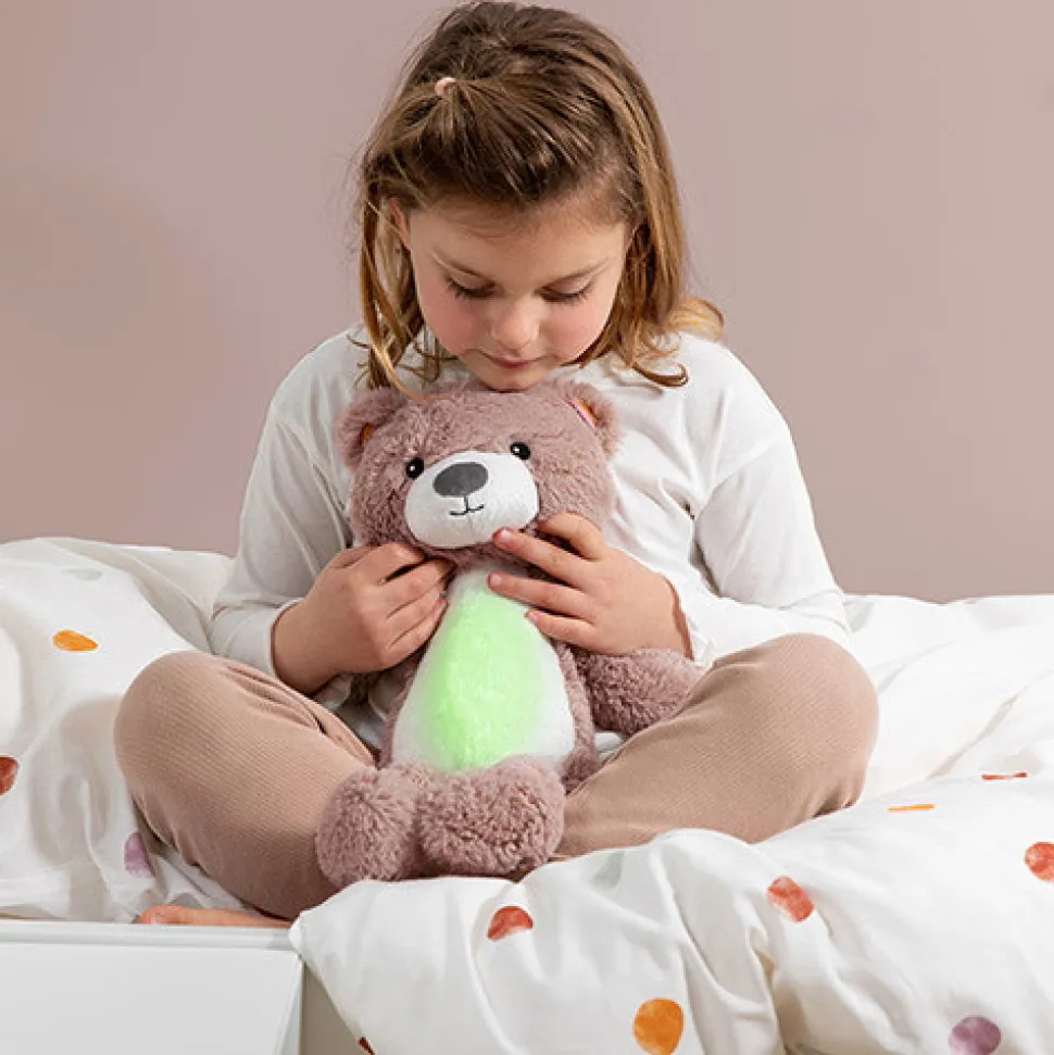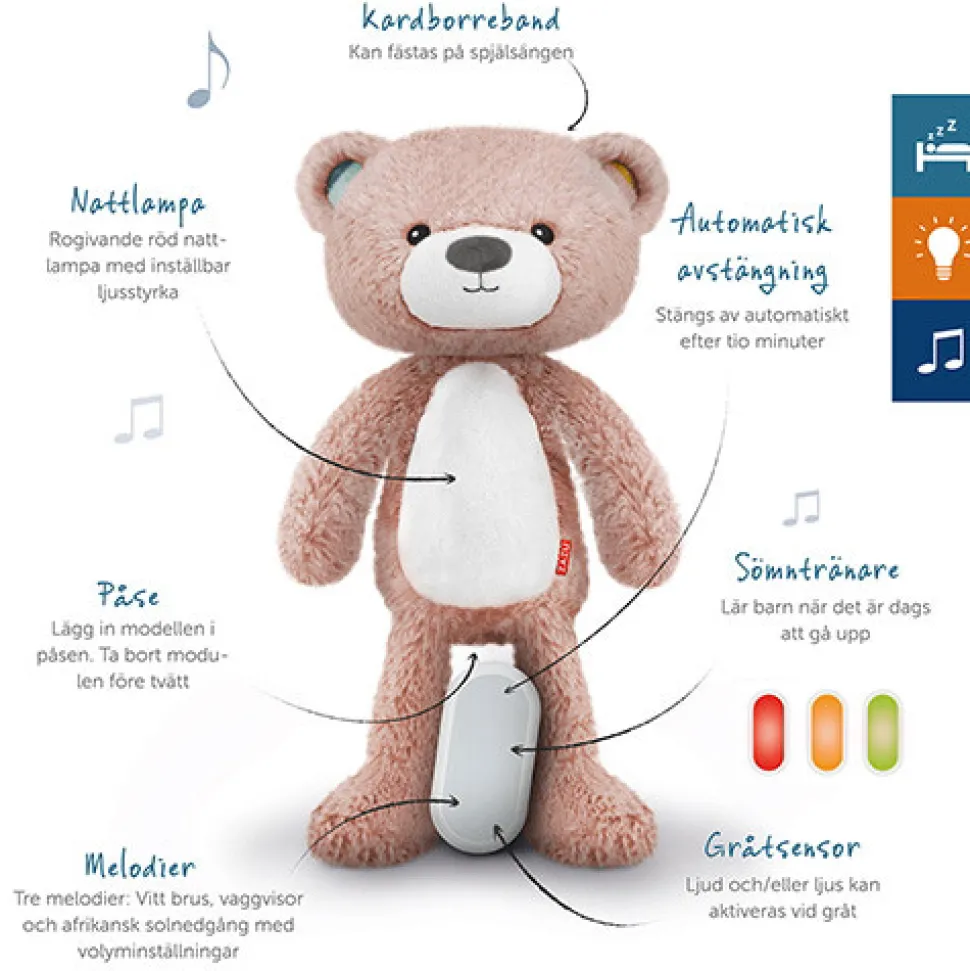 Sød bamse, der er søvntræner, natlampe og spilledåse i ét. Brody lærer dit barn at forstå forskellen mellem nat og dag, lyser op i mørket og afspiller lyde. Den søde bamse Brody hjælper dig og dit barn med at sove godt hele natten. Når det er tid til at sove, kan du bruge Brody til at spille vuggeviser, mens han trygt skinner med sit beroligende lys. I de tidlige morgentimer fungerer Brody som søvncoach, og hjælper dit barn ved at skifte farve for at vise, hvornår det er tid til at stå op (eller hvis du skal vente lidt længere).