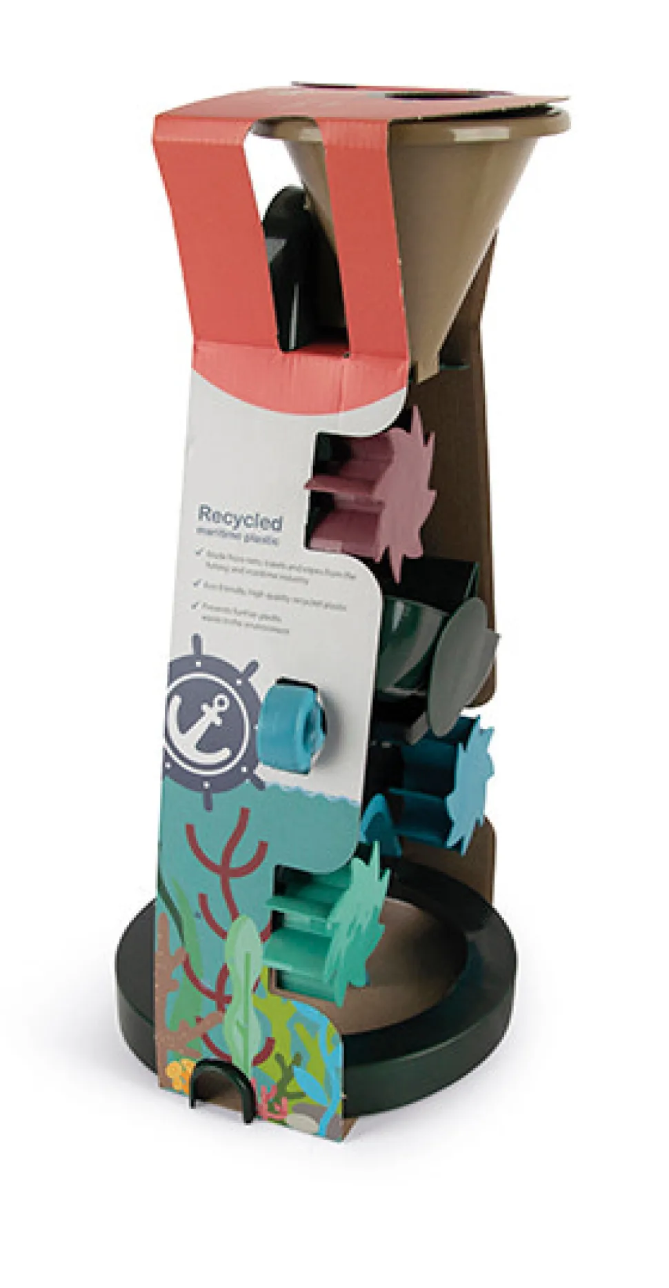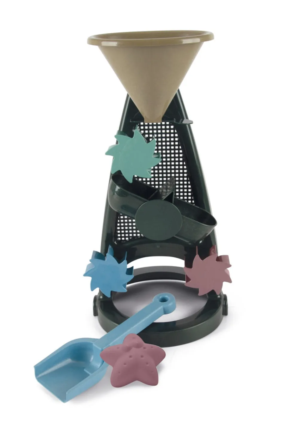 Et fint sæt med en skovl, en sandform og en stor mølle, hvor både sand og vand kan rende igennem. Møllen har en vippe og en sluse, så barnet selv bestemmer, hvor meget sand eller vand, der sluses igennem hjulet. Sættet giver rig mulighed for sanselig leg og udforskning i naturen ved stranden eller i sandkassen og styrker bl.a. barnets finmotorik samt øje- og håndkoordination. Sand- og vandmøllesættet fra Blue Marine Toys er, som alt øvrigt legetøj fra serien, lavet af genanvendt plast, der stammer fra maritimt udstyr såsom net, trawl og reb. Disse restmaterialer bliver omdannet til legetøj i Hobro, i som en præventiv handling der kan mindske mængden af maritimt gear i havene. Sand- og vandmøllesættet fra dantoys maritime univers, Blue Marine Toys, består af flere elementer, der giver rig mulighed for sanselig leg og udforskning ude i naturen med sand og vand.