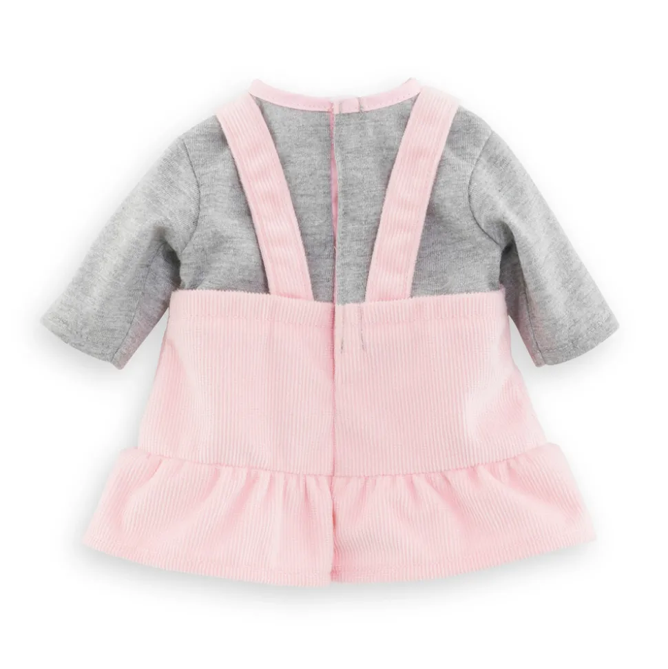 Med denne tidløse grå og lyserøde kjole kan din dukke være klar til både hverdagens eventyr og festlige begivenheder, og dit barn kan have timevis af sjov og leg.
