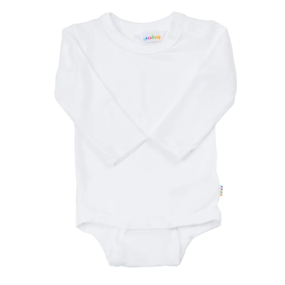 Body med lange ærmer. Trykknapper på den ene skulder samt mellem benene for nemmere påklædning. En elastisk økologisk bambuskvalitet som er dejlig blød og lækker. Perfekt at bruge inderst.