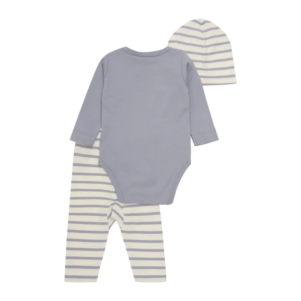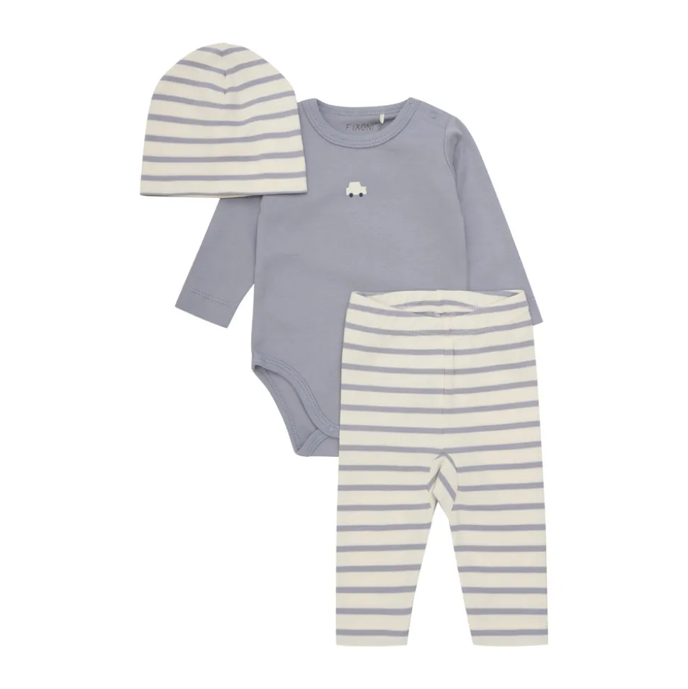 Sættet består af en langærmet body, behagelige leggings og en matchende hue. Det er designet til at kombinere stil og komfort, ideelt til både leg og hverdagsbrug.