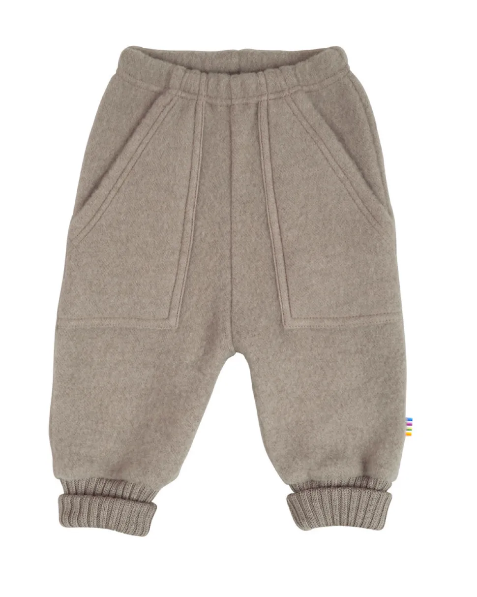 Baggy bukser. Blød elastik i taljen. Store sidelommer som sød detalje. Har bred ribkant i benene som kan foldes ned, så banet kan bruge buksrne længere. En kraftigere børstet uldkvalitet som er ekstra blød og lækker.