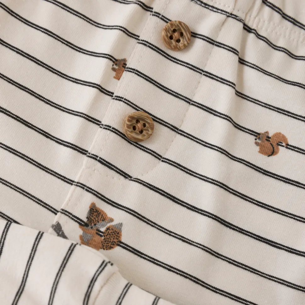 Bukser med striber og sødt dyremotiv fra Minymo. Disse bukser har et legende design med striber og et charmerende dyremotiv foran. De er udstyret med elastik i taljen for en behagelig pasform og har en dekorativ snydegylp med knapper, der fuldender det fine udtryk.
