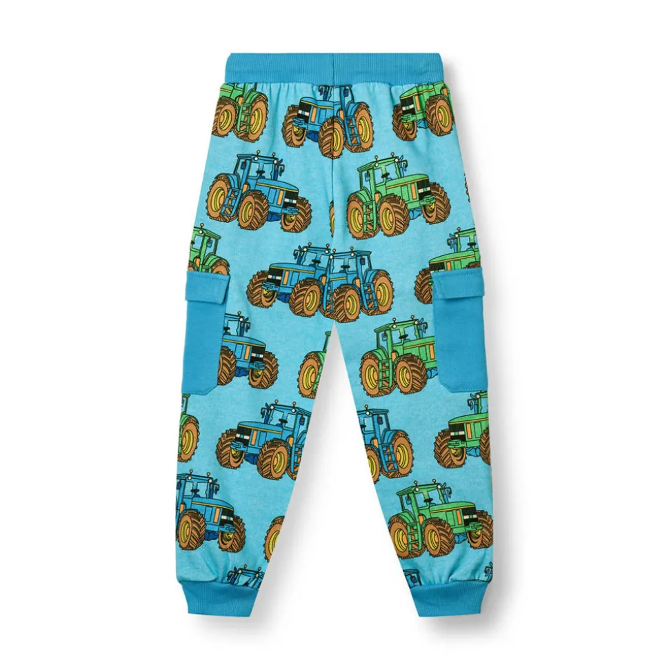 Bukser i et ubørstet sweat materiale med traktorer, produceret i 100% økologisk bomuld. Bukserne har en afslappet pasform med almindelige buede lommer foroven og cargo-stilet lomme med flap på begge sider af benene. Bukserne har ribkant i taljen med elastik og snore til justering, samt ribkant i manchetter.