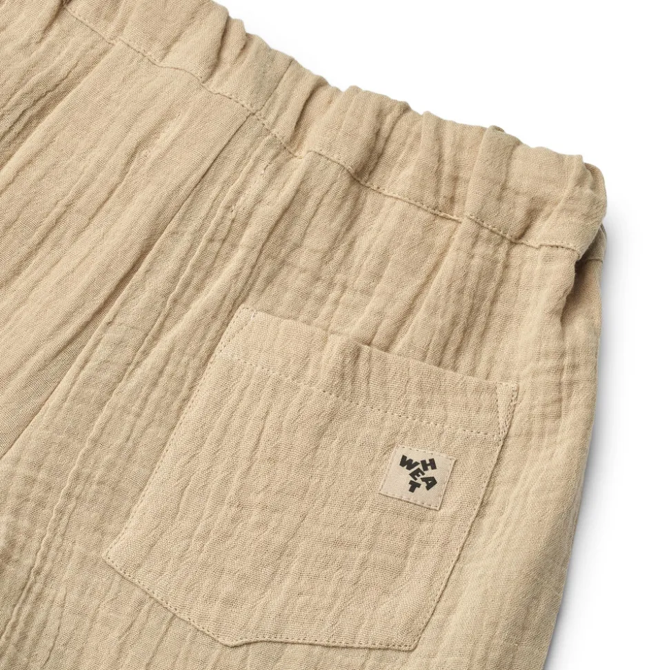 Wheat’s bukser er perfekte til ethvert arrangement, som sommeren måtte byde på. Buksernes pasform er løs med blød elastik i taljen samt bindebånd. De har en lille lomme bagpå, og kan desuden rulles let op i benene for et mere afslappet look. Sæt bukserne sammen med en fin skjorte til festlige anledninger eller kombiner dem med en basis overdel for at style outfittet til hverdag.