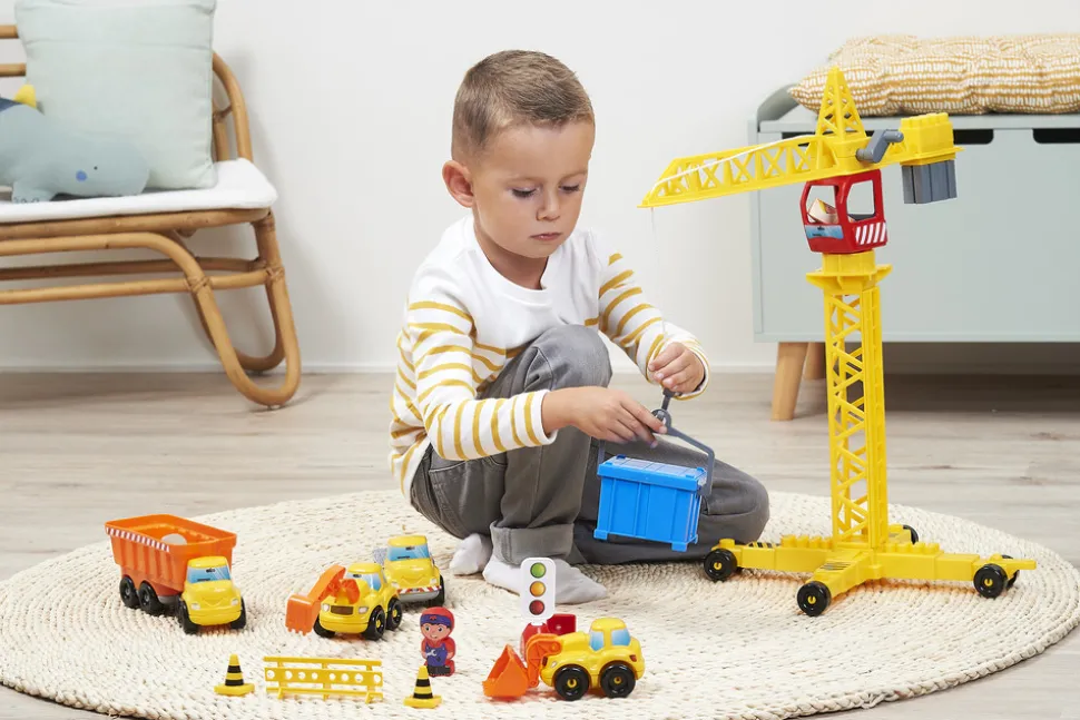 En byggeplads, der omfatter 4 køretøjer, 2 figurer, en kran, skilte og meget tilbehør.