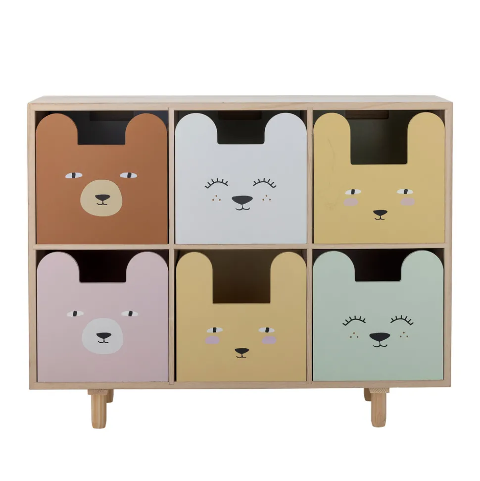 Calle Bogreol m/skuffer fra Bloomingville MINI er i et hyggeligt og funktionelt design, der passer ind i ethvert rum. Reolens skuffer er vendbare, så man selv kan vælge mellem at vise søde dyremotiver, mønstre eller den enkle træfarvede side. Den fleksible reol kan placeres både lodret og vandret, hvilket giver utallige indretningsmuligheder og gør, at Calle Reolen kan tilpasse sig hjemmets skiftende behov gennem tiden.