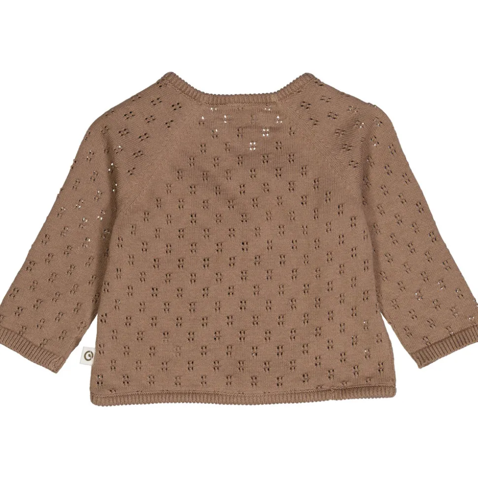 Lækker, blød baby cardigan med kryds lukning foran som gør det lettere at skifte tøjet på baby. Cardiganen lukkes med bindebånd og er lavet i en blød strik kvalitet. Denne cardigan laves i størrelse 44-74 og kan derfor bruges til meget små babyer. 100 % hulmønster bomuldsstrik (). Produktet er GOTS organic- certificeret, hvilket betyder at bomulden er certificeret økologisk, og at der i alle andre processer som farvning, strikning og syning er taget de strengeste hensyn til miljøet. GOTS er internationalt anerkendt som den førende standard for forarbejdning af tekstiler af økologisk bomuld. Derudover tages der også hensyn til arbejdsforholdene, hos dem der producerer tøjet. Økologisk bomuld 100%