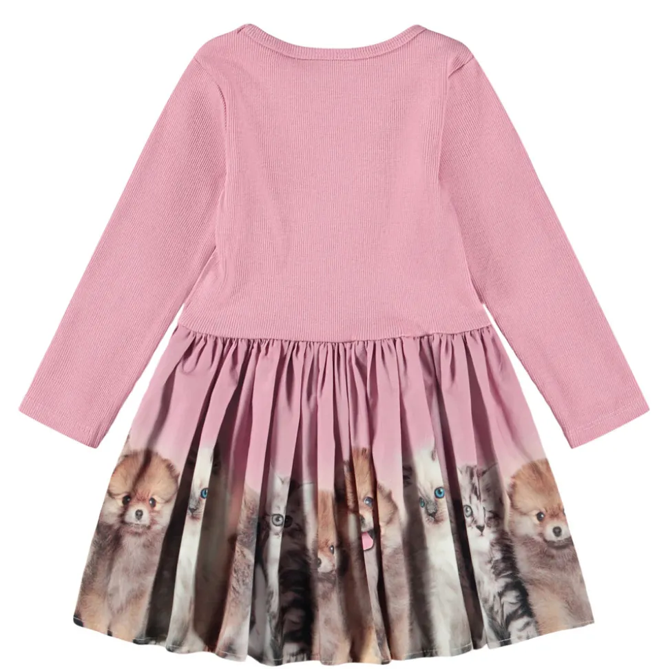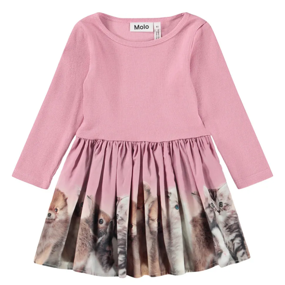 Kjole i økologisk bomuldsjersey med tætsiddende overdel i rib og et let, fyldigt skørt i poplin, der skaber en smuk silhuet. Kjolen lukkes med knap ved skulderen for nem påklædning.
