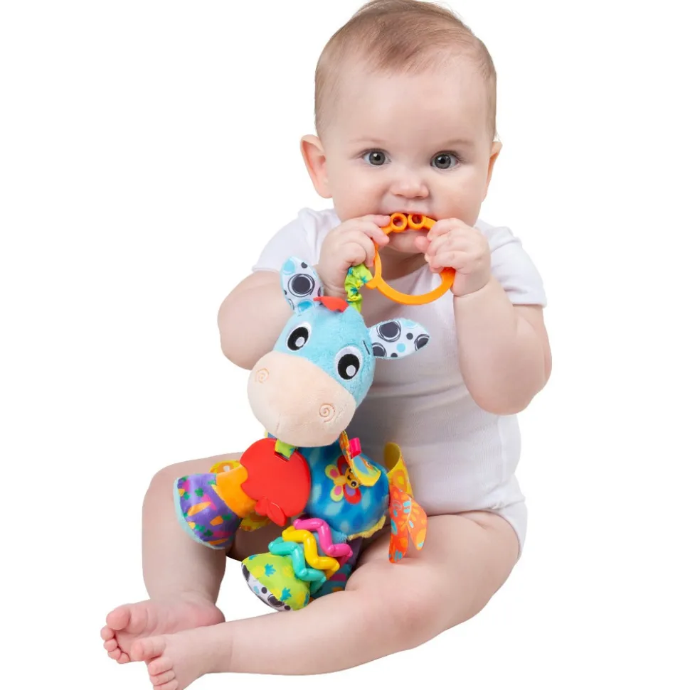 Den fine hest har masser af farver og detaljer, som baby kan både kigge på og undersøge med hænderne. Den er smart at have med på tur, hvor den kan underholde og stimulere barnets sanser.