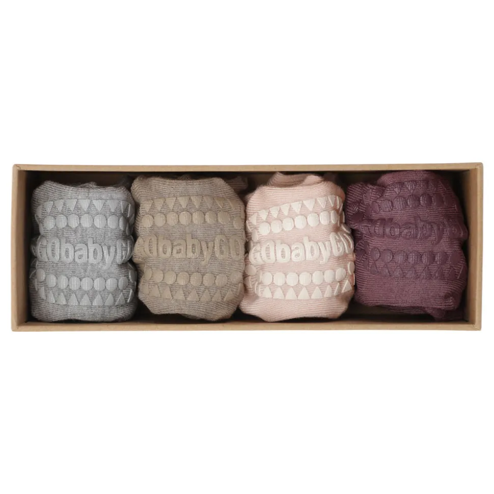 Pakke med 4 stk. GoBabyGo skridsikre strømper i bambus. Strømperne med skridsikre såler og gummidutter på tæerne er til børn, der elsker at kravle, gå og løbe uden at glide. Styrker barnets motorik, balance og selvsikkerhed.