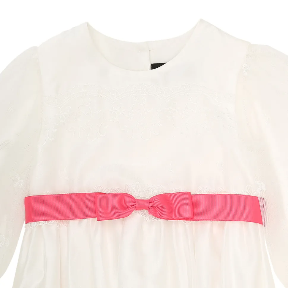 Dåbssløjfe i riflet satin som bindes på ryggen. Den forknyttet sløjfe fæstnes foran i taljen med medfølgende sikkerhedsnål. Bredde 3 cm.