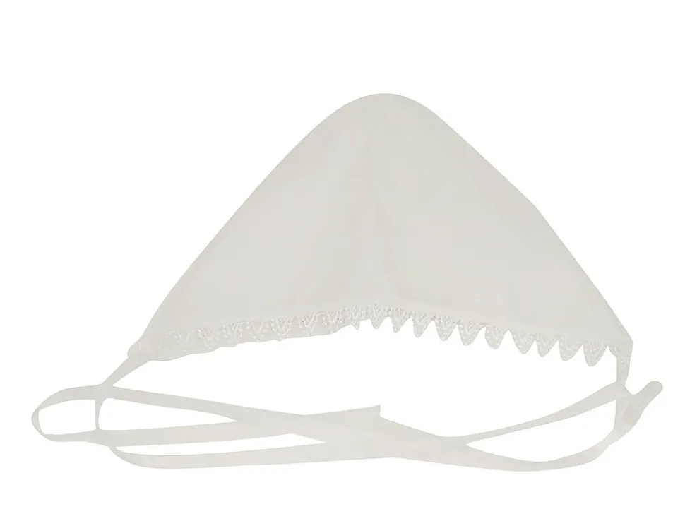En sød dåbshat med broderet kant og bindebånd under hagen.