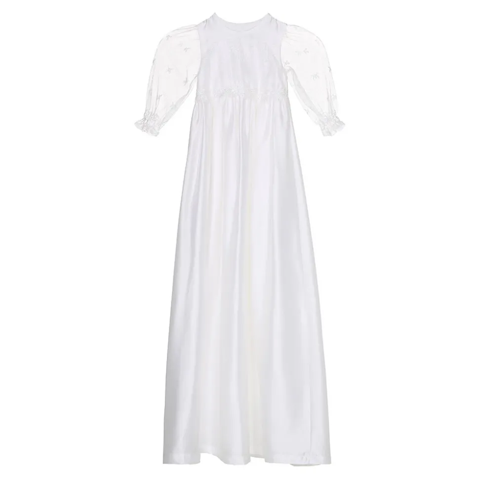 Elegant enkelt dåbskjole i hvid satin med bærestykke i en fin blonde.