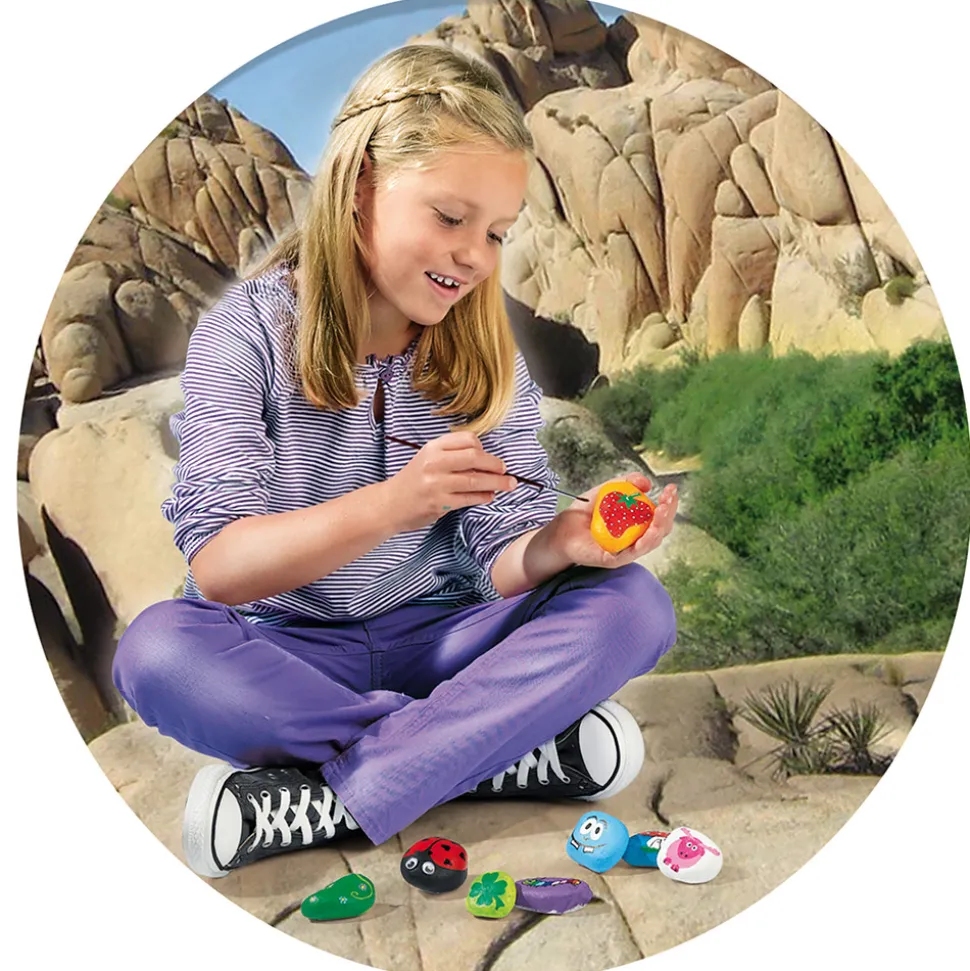 Dette kreative sæt indeholder alle materialer til at male en sten og dekorere den. Lav forskellige varianter med de 6 grundfarver og påfør de sjove øjne, og giv stenen en identitet.
