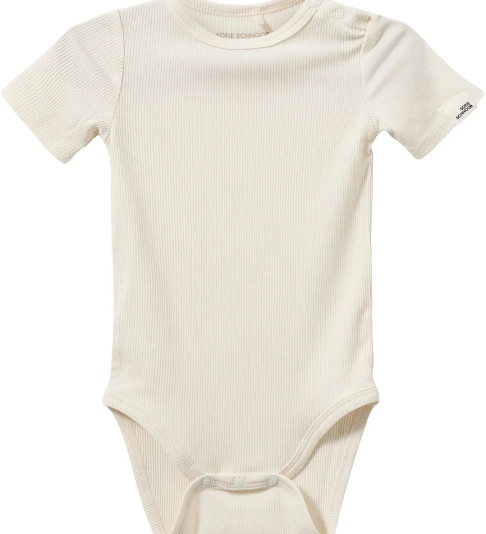 Enkel moderne body i ribbet stof af lækker kvaltit. Trykknapper ved skulderne for nemmere at få af og på, og ligeledes mellem benene for lettere bleskift.