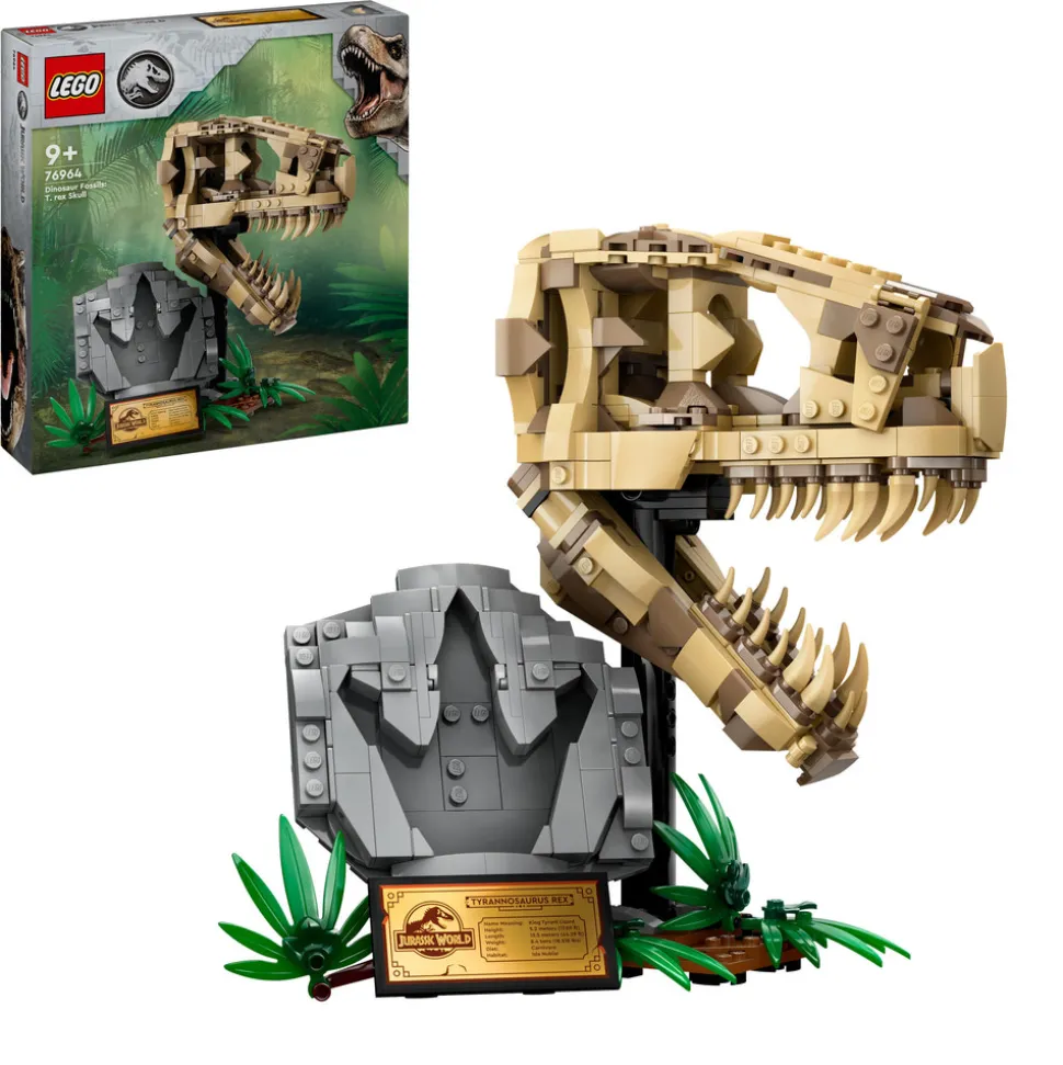 Saml dit eget T. rex-kranium 76964 og udstil det! Dyk ned i dette LEGO® Jurassic World sæt, og skab din egen version af den mægtige dinosaurs hoved. Kraniet har en bevægelig kæbe, der kan åbnes eller lukkes. Der er også et “fossilt” fodaftryk og et skjult stykke “rav”, som kan føjes til udstillingen. Afslut modellen med en infoplade. Du kan tage kraniet af standen og ændre din udstilling når som helst.