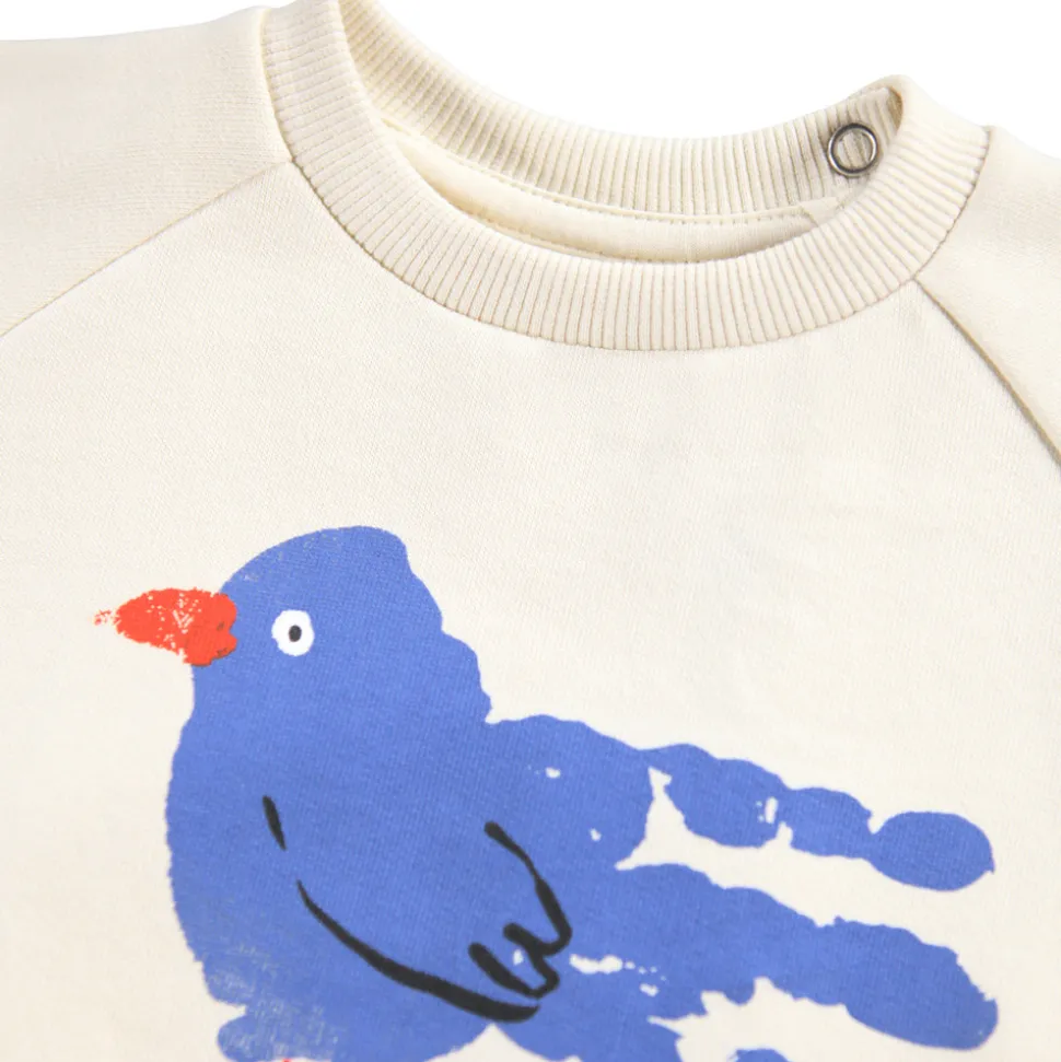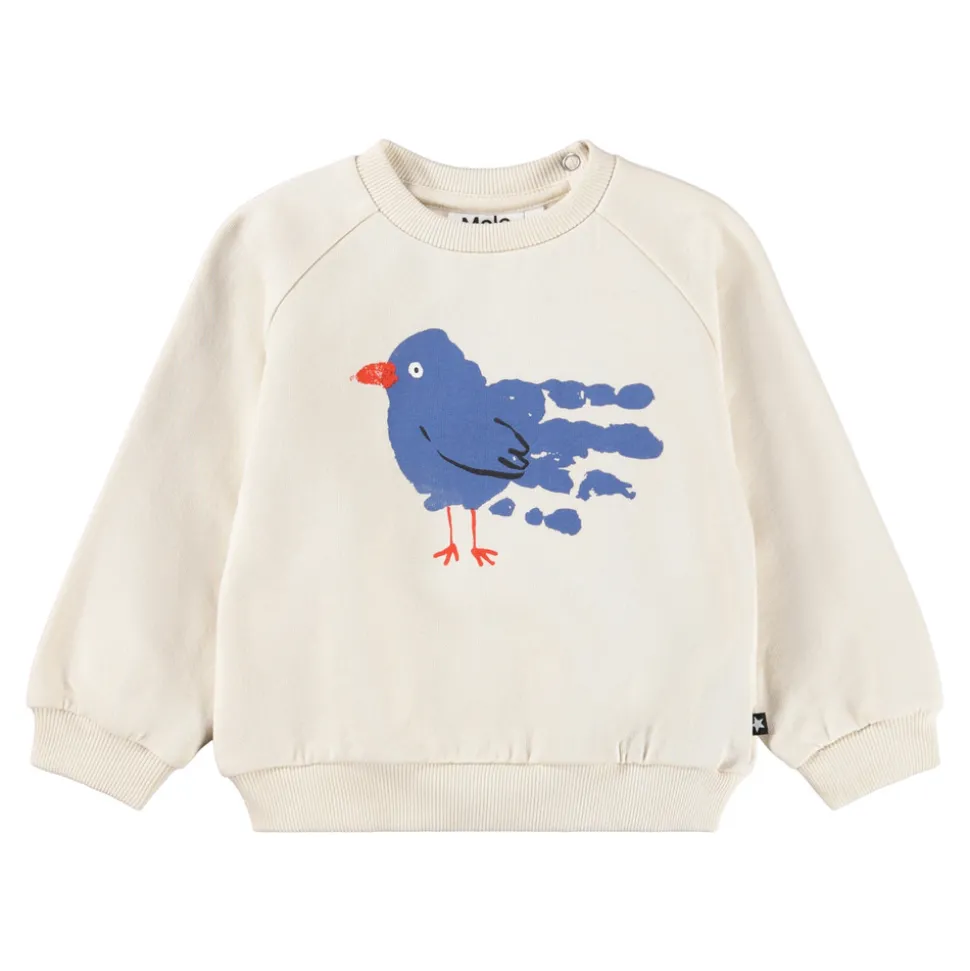 Sweatshirt i blød økologisk bomuldsjersey med raglanærmer og ribkanter ved ærmer og hofte. Den runde halsudskæring har to praktiske trykknapper i nakken, som gør den nem at tage af og på.