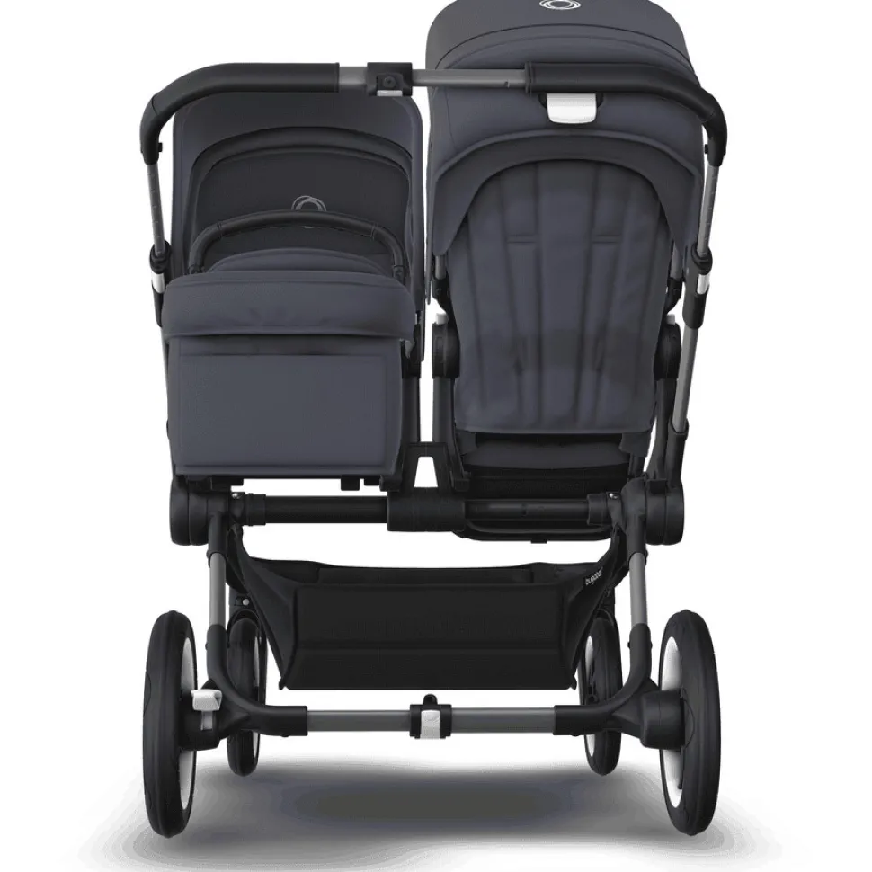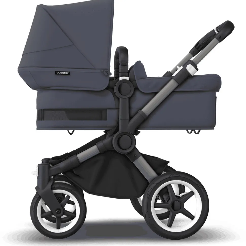 Med denne Bugaboo Donkey5 er der ekstra opbevaring lige ved siden af sædet, så man nemt kan komme til sin taske, og have varekurven fri til indkøb. Varekurven er god rummelig, har ekstra små lommer og er godkendt til 10 kg. Styret har teleskop styr, som nemt justeres i højden, og tilpasses “føreren” af vognen. Med de drejbare forhjul, er det en vogn som er let at køre med, og hvis turen går til mere ujævn terræn f.eks. skoven, er de lige til at låse. Med de skumfyldte hjul og gode affjedring, gør det turen behagelig og komfortabel for både barnet og forældrene. Der er mulighed for at tilkøbe adapter, så de fleste babyautostole nemt klikkes på stellet. Når det ekstra sæde anvendes kan den ekstra opbevaringskurv ikke bruges!