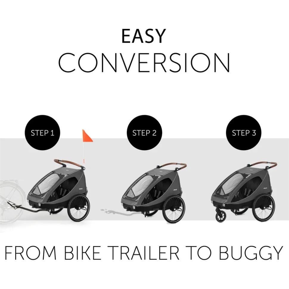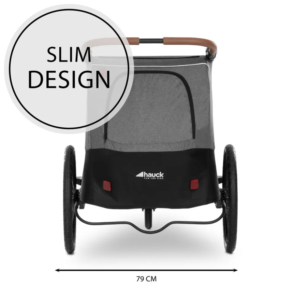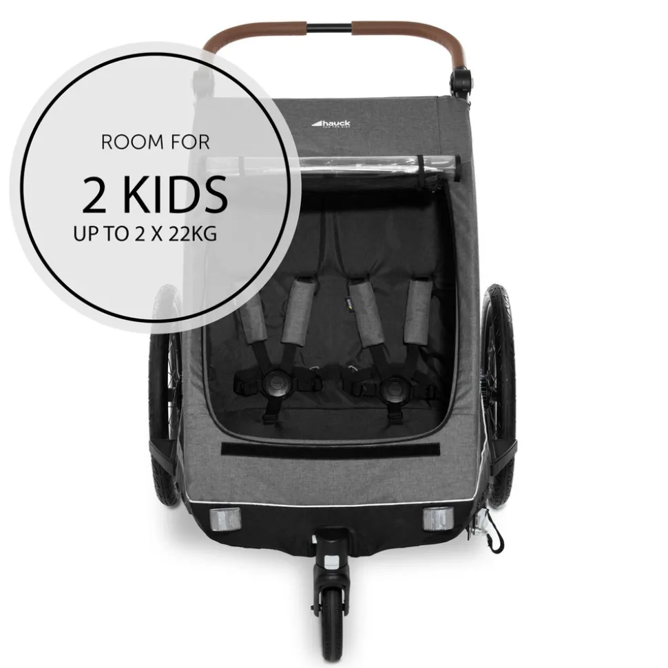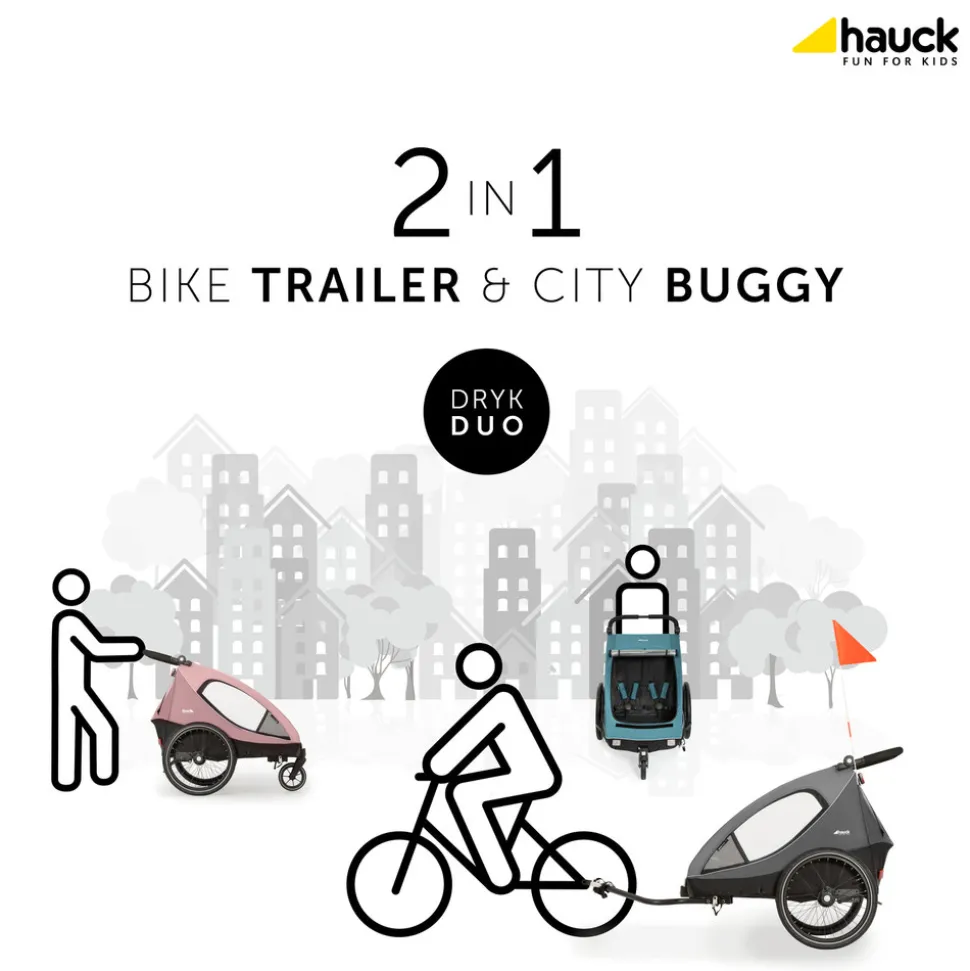 Dryk Duo er en sporty cykelanhænger fra Hauck – perfekt til forældre, der vil have en vogn, der både kan bruges i terræn- og bymiljøer. Dryk Duo tilbyder en sikker og behagelig rejse for to børn fra 6 måneder og op til 120 cm eller 22 kg. Når du ikke bruger, kan du nemt folde den sammen med én hånd.Vognen er kun 79 cm bred, hvilket gør det let for dig at komme gennem trange områder og køre på smalle cykelstier i byen. Vognen er indvendigt rummelig med flere opbevaringsmuligheder. Den har sæder med fempunktssele, så børnenen sidder sikkert i vognen under rejsen. Udenpå har den en foldbar vejrbeskyttelse, der beskytter mod regn og vind. De store lufthjul giver en blød og behagelig køretur.Der medfølger et gåturssæt, så du hurtigt og nemt kan lave cykelanhængeren om til en normal vogn efter behov. Forhjulet er fremstillet af slidstærk gummi og kan låses, hvis du ønsker det.Specifikationer: