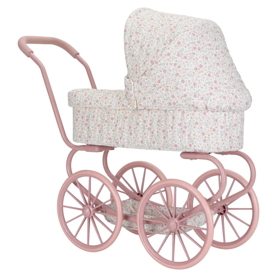 Gå dejlige ture med denne robuste dukkevogn i metal, og giv din dukke sit livs tur! Takket være de fire store hjul ruller vognen jævnt og stabilt og er perfekt til både indendørs og udendørs brug. I bunden er der en praktisk opbevaringskurv, så dukketilbehøret altid er inden for rækkevidde. Det lyserøde stel og de bløde håndtag fuldender denne stilfulde barnevogn.