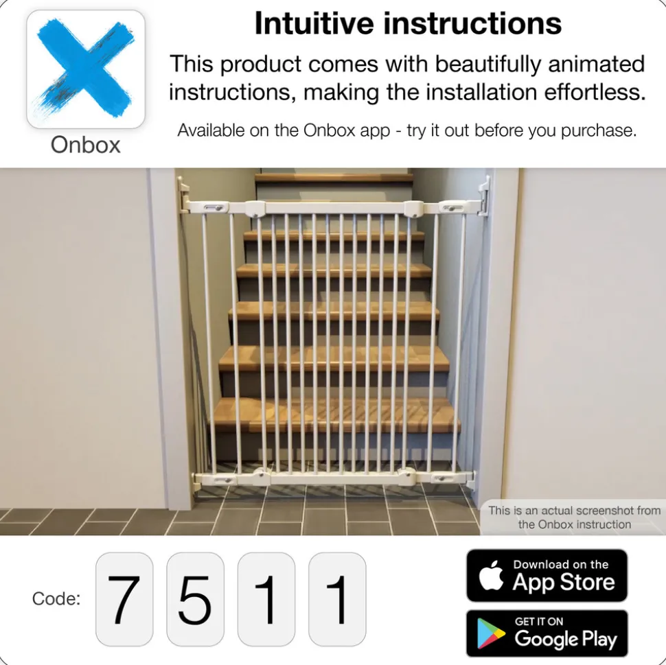 Ved at downloade appen OnBox fra BabyDan til din smartphone kan du få monterings / opsætnings guide ved at taste de første 4 cifre af varenr. – så du er sikker på at gitteret er monteret korrekt.