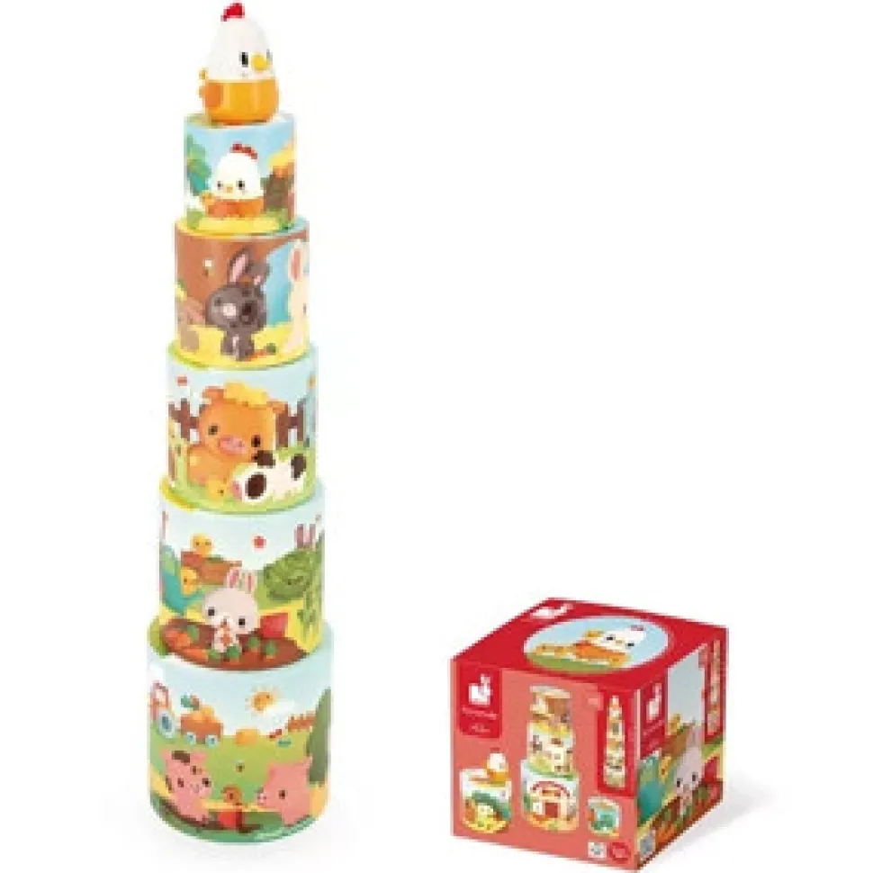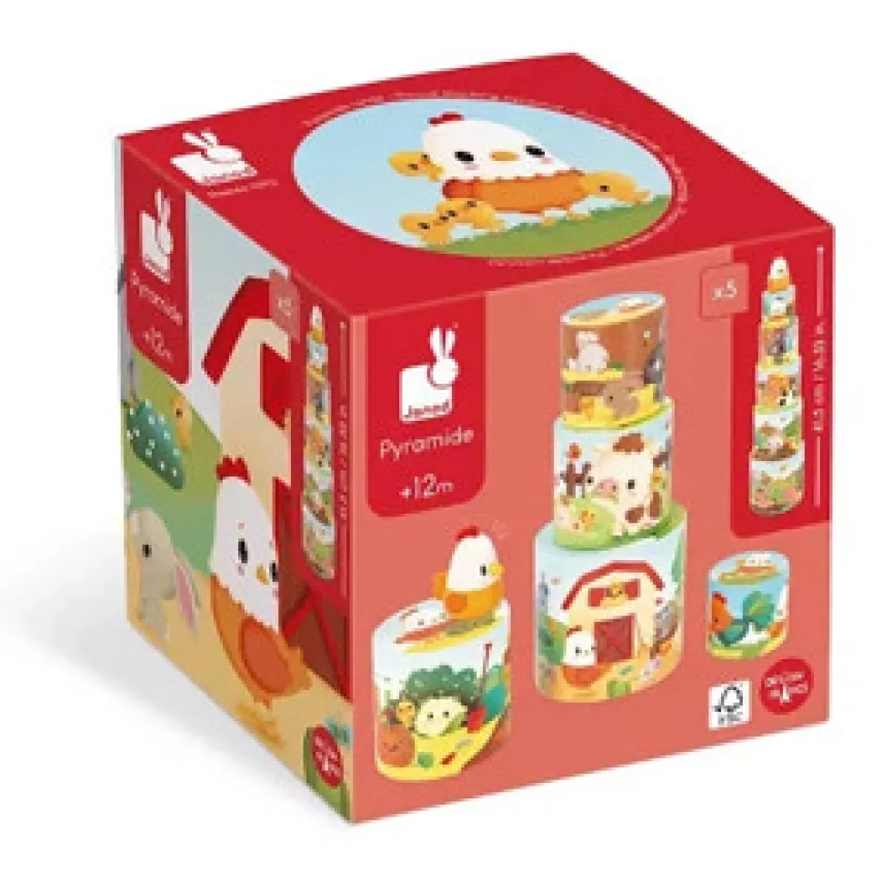 De 5 gårdtematiske former, der udgør pyramiden, er fyldt med illustrationer af grise, køer, kaniner og selve laden… alle gårddyrene er kommet ud for at lege. En yndig træfigur af en hønemor, der leder efter sine kyllinger, som er løbet væk for at udforske gården, er også inkluderet. Du kan gemme figuren under de forskellige kuber og lade børn fra 1 år og opefter finde den, eller opfordre dem til at finde alle kyllingerne, der er afbildet.