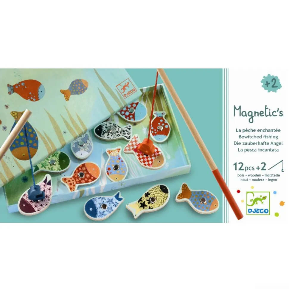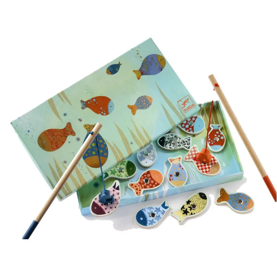 Fiskespil – Fortryllende Fiskning Lækker æske med 12 søde magnetiske træ-fisk samt 2 fiskestænger. Så kan jagten begynde. Mål: 28 x 15 cm