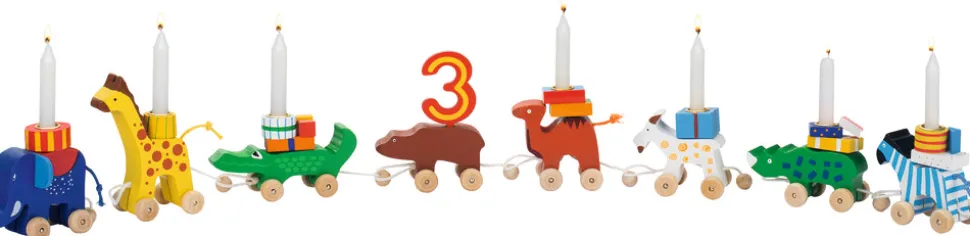 Fødselsdagstog i cirkus tema. Sjove dyr i flotte farver. Toget leveres med tallene 1 – 6. Lys medfølger ikke.