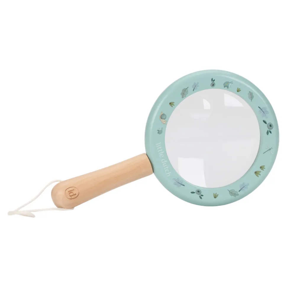 Udforsk naturen med dette forstørrelsesglas! Den robuste træramme og det behagelige håndtag sikrer et godt greb, mens de smukke illustrationer tilføjer et legende touch. Forstørrelsesglasset har en ekstra lille linse, så du kan se endnu flere detaljer. Med en praktisk snor til ophængning er det altid inden for rækkevidde for nysgerrige opdagelsesrejsende. Perfekt til små eventyrere, der vil udforske verden omkring sig og finde små væsner.
