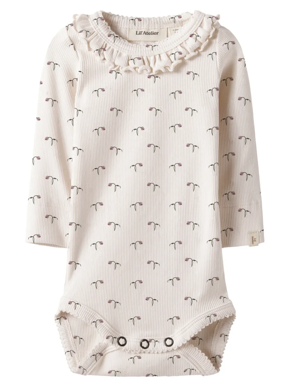 Sammensæt det perfekte outfit til dit barn med kvalitetsdagsmodetøj og skab et behageligt og trendy look.Jersey er et let og elastisk stof med en blød overflade og inderside, der giver en behagelig fornemmelse og bevægelsesfrihed. – Produkttype: Bodysuit – Halsudskæring: Rund halsudskæring – Ærmer: Lange ærmer (L/S) – Lukning: Trykknaplukning – Ekstra detaljer: Mærke, flæser, babylock-detaljer – Tryk: Tryk gentaget over hele produktets overflade – Advarsel: ADVARSEL! Holdes væk fra ild