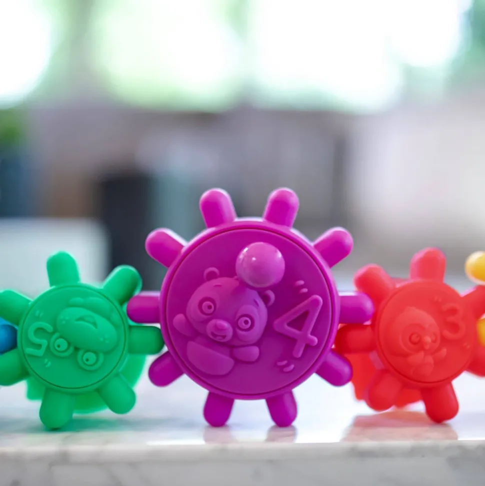 Ubegrænset leg – baby kan sortere, stable, stille og dreje 5 tandhjul, der alle har forskellige størrelser og farver. Udviklingsevner – tandhjulene er gode værktøjer for forældre til at hjælpe deres små med at opdage tal, dyr og farver. De fremmer også finmotorik, den rumlige fornemmelse samt årsag-og-virkning færdigheder. Brug de forskellige aktiviteter til badekarret, til leg på gulvet, eller hvor som helst babys nysgerrighed fører dem hen! Tandhjulene har alle en sugekop, så de kan klæbe til fliser og de fleste glatte overflader. Legesyge venner – med populære karakterer fra den nye Baby Einstein YouTube-serie. De er nemme at rengøre, lavet af BPA-fri materialer, som du kan tørre af.