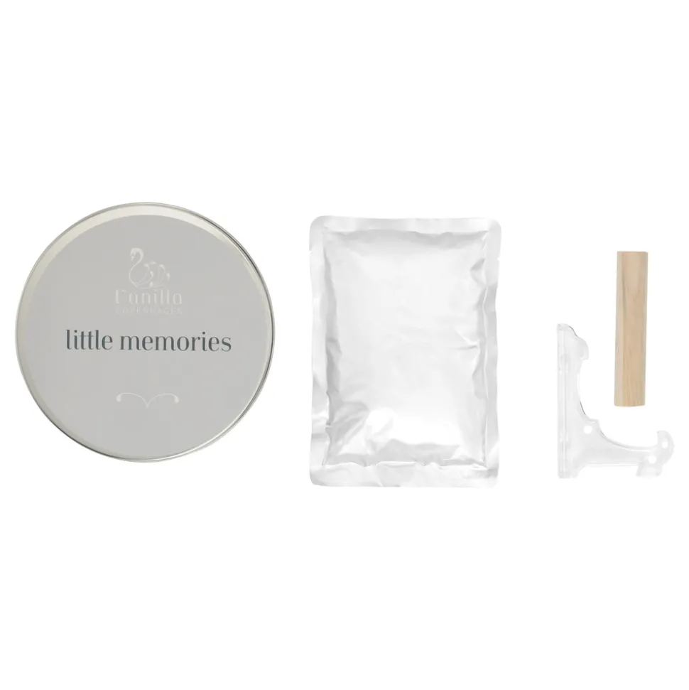 Instruktioner: Hold posen lukket indtil brug. Blødgør leret ved at ælte det i to-tre minutter, eller indtil det er blødt og alle luftbobler er væk. For at undgå at leret klistrer til overfladen anbefales det at anbringe det på plastikfilmen fra posen. Rul leret ud med trærullen til en tykkelse der passer til tinæsken. Tryk forsigtigt barnets hånd eller fod ned i leret og lav et aftryk. Når aftrykket er lavet, skal det overskydende ler skæres væk så aftrykket passer til tinæsken. Anbring ler-aftrykket i boksen og lad det lufttørre på en flad overflade. Lad aftrykket tørre i 2 dage på et køligt sted. Når leret er tørt, kan tinæsken placeres i akrylfoden eller bare i tinæsken til minde om det særlige øjeblik.