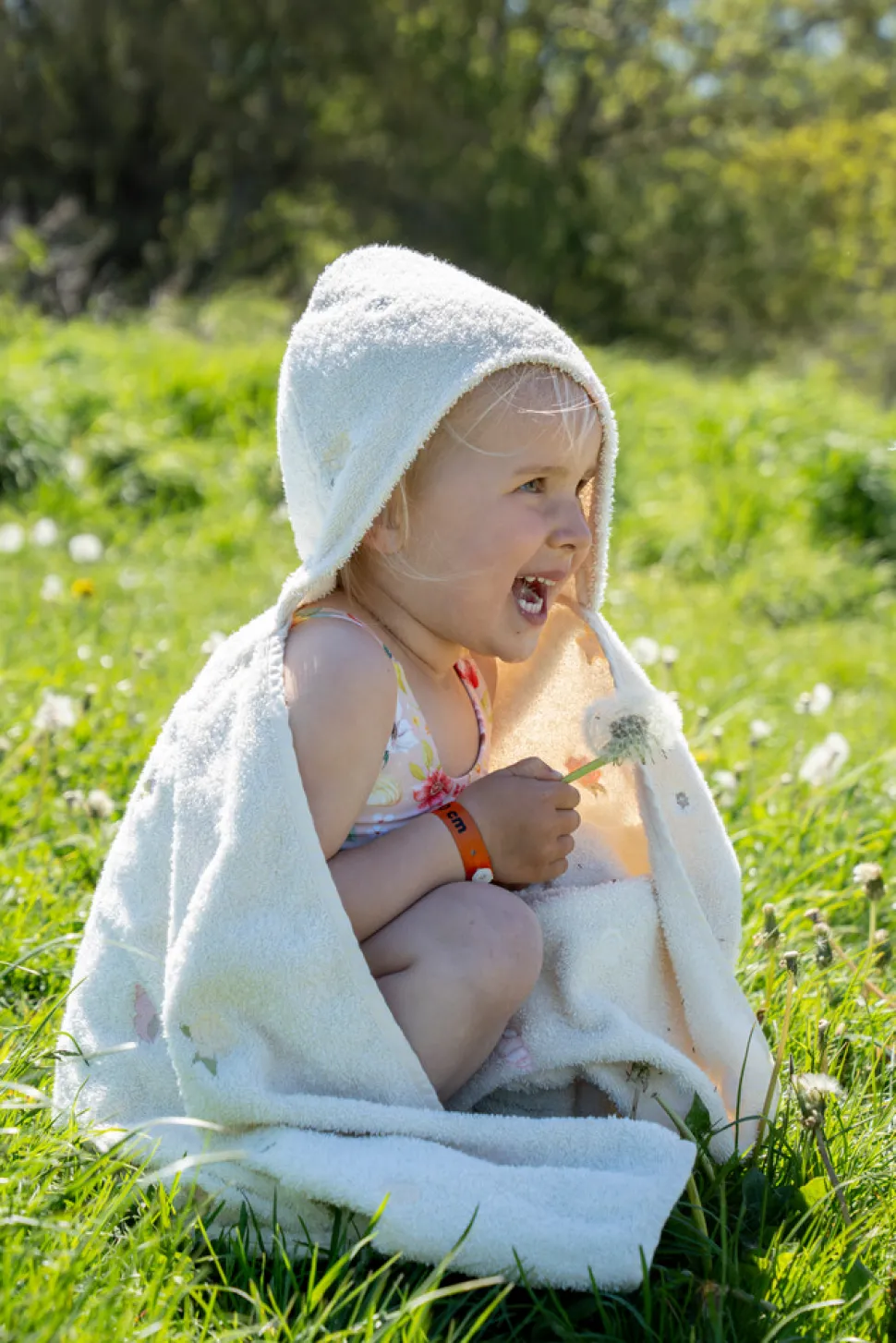 Når du har brug for en pause efter at have leget i vandet, er der intet bedre end at svøbe dig i det blødeste badehåndklæde og putte dig ind til dine forældre. Det store badehåndklæde med rummelig hætte er lavet af 100% økologisk bomuld i en utrolig blød kvalitet og med smukke broderede detaljer. Med smarte trykknapper i siderne sidder ponchoen også godt, når du leger. Det har aldrig været sjovere at komme op af vandet!