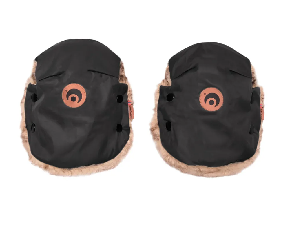 Herlige håndmuffer i samme materiale som køreposerne i vand- og vindtæt polyester, foret med kunstpels. Kan fastgøres til håndtaget på barnevognen, og holder dig varm på turen. Håndmufferne kan kobles sammen, så de kan bruges enkeltvis eller sammensat.